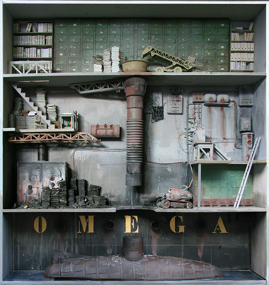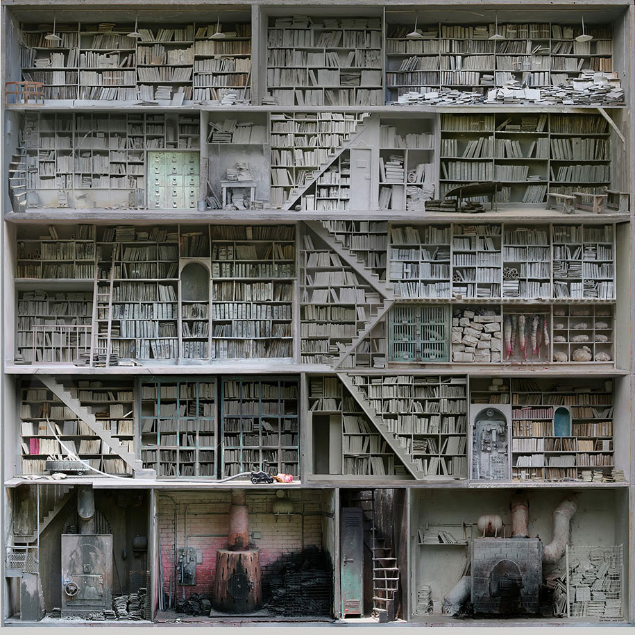 French artist Marc Giai-Miniet creates miniature dioramas known as ‘Boxes‘, reminiscent to the paper theater from ‘pictorial broadsheet’ culture of the 19th Century during the Biedermeier period. Throughout the numerous levels of the miniature models you will find grim scenes, gloomy rooms, and dark, dusty corners. Initially Giai-Miniet’s works featured small characters, but those are a distant memory. Now his works mostly feature libraries, fictional attics, sci-fi laboratories, storage rooms, and interrogation cells that tell stories of odd experiments and unknown events that have taken place. Even though each room is cluttered with tiny objects such as machinery, floor-to-ceiling amounts of books, and huge translucent shelves, they are still neatly organized and intricate in every detail.