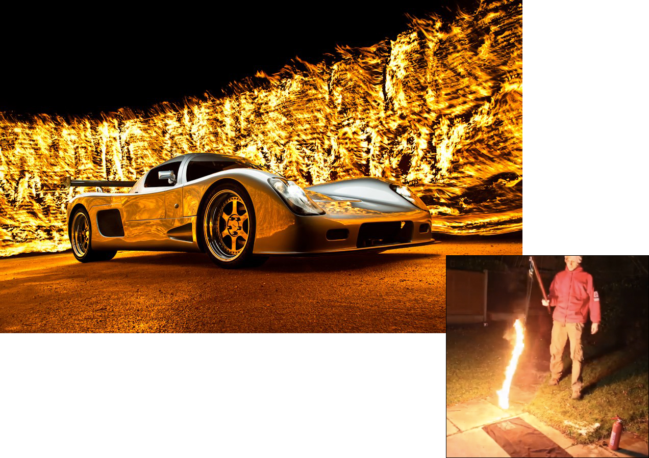 Not for the careless or faint of heart, this method from Barry Elder nonetheless yields stunning results. You’ll need fuel, a rope or strap, a long fireproof pole, a lighter, a wet towel, and an assistant (or two). Be sure to have a fire extinguisher handy. Hang the rope from the pole, dip it in the fuel, ignite it, then open the shutter and walk along the path where you want the wall to appear. Then carefully extinguish the flame.