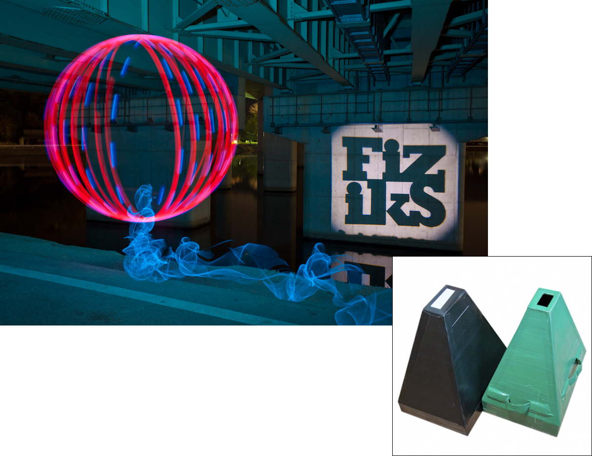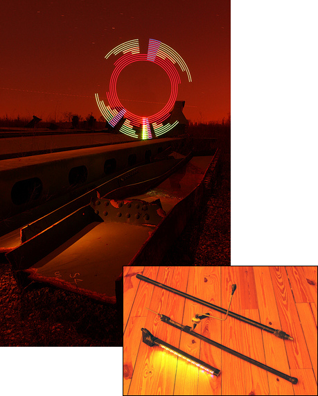 Patrick Scherer uses a handheld electric drill to drive his rig, which consists of a photo light stand, a black emitter mount, and a generous serving of duct tape. Turn on the lights, open the shutter, and slowly spin up the drill. The lighting elements, whatever they are, should have some flex, so that centrifugal force will cause them to bend outward as the drill speed increases.