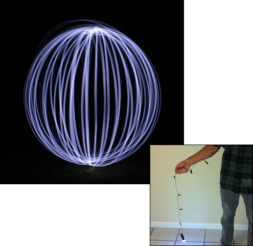 All you need for this basic trick is a string of battery-operated holiday lights and some duct or other dark tape. Tape 10 or so lights at the end of the string into a bunch, then tape over the remaining bulbs to block the light. You can also add colored gels for effect. To use, open the shutter of your camera and swing the lights around in a circular motion while rotating your body through 360º.