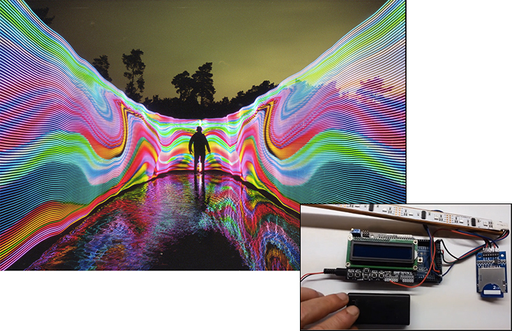 Unlike the other “analog” tools on this page, this is a full-featured programmable RGB LED light wand, built around an Arduino with an SD card reader and a small screen so you can load your images and go. All you have to do, once you start your exposure, is move the LED wand at a more-or-less even pace; the microcontroller takes care of the rest.