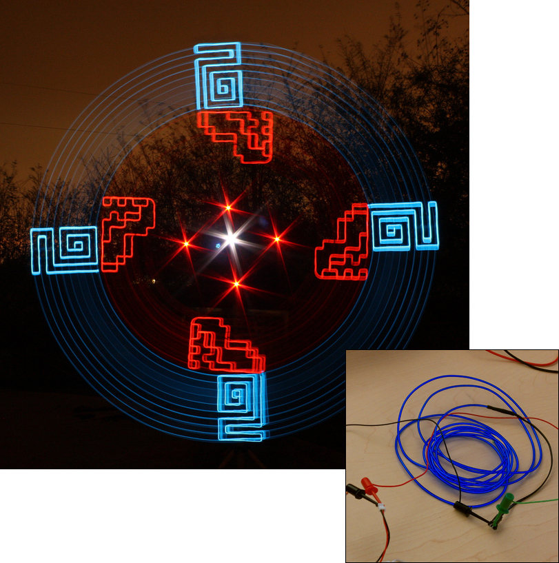 Though artist Wes Whaley has so far been close-mouthed about the details of this tool (a tutorial is “in the works”), it’s known that he uses carefully shaped pieces of electroluminescent (EL) wire to punctuate conventional spinning arcs with contrasting angular, highly geometric patterns.