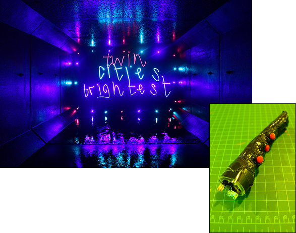 Dana Maltby’s light pens are made from holiday lights, batteries, lots of tape, and some simple on/off switches. Using one is as simple as pointing it at the camera lens and drawing in the air. Renowned light painter Darren Pearson has used Dana’s light pens to create everything from skateboarding skeletons to dinosaurs.