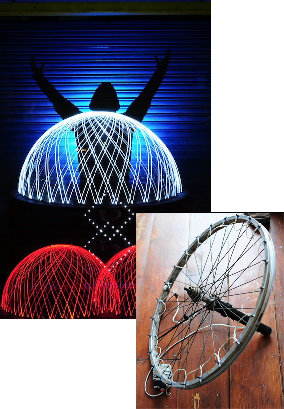 Andrew Whyte’s dome-painting rig is built on an old bike wheel with an axle that extending the length of the wheel’s radius on one side. Holiday lights are mounted along the rim. To use, just tip it over on the axle, start the exposure, flip the lights on, and give it a spin. The wheel rolls in a circle around the axle, and the lights on its edge trace out a beautiful dome.