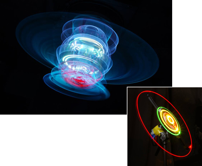 Patrick Scherer uses a handheld electric drill to drive his rig, which consists of a photo light stand, a black emitter mount, and a generous serving of duct tape. Turn on the lights, open the shutter, and slowly spin up the drill. The lighting elements, whatever they are, should have some flex, so that centrifugal force will cause them to bend outward as the drill speed increases.