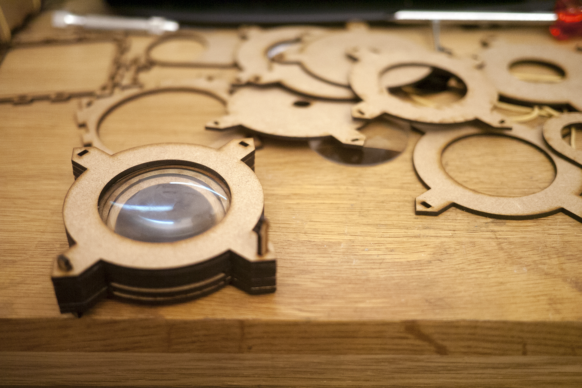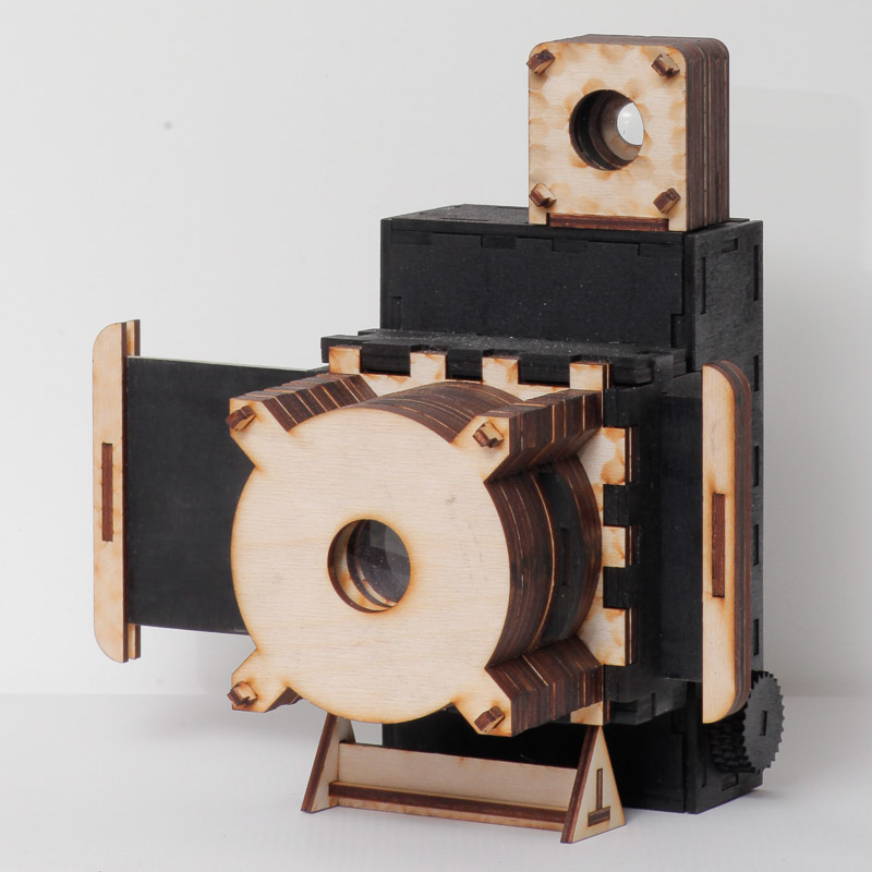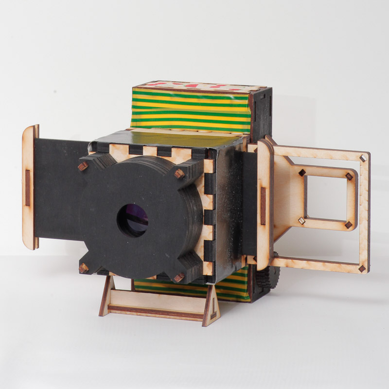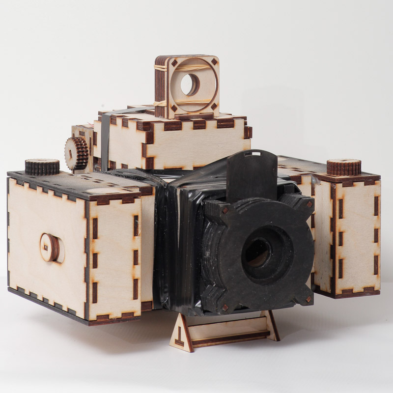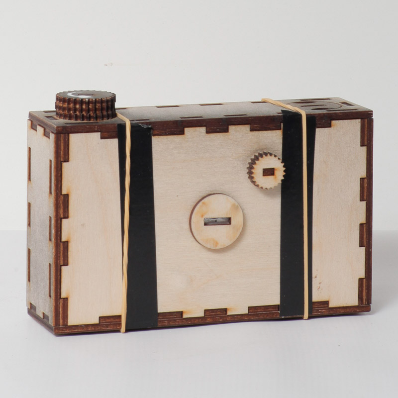 If you have access to a laser cutter, you can cut out and assemble modules to allow you to construct a variety of different types of cameras. By downloading the different modules you can explore all kinds of apertures, viewfinders, light benders, and film systems. The parts that aren’t laser cut are the lens and mirror. They recommend that you experiment a bit with lenses, trying things like using cheap magnifying glasses and harvesting parts from cheap zoom lenses. Here are a few examples from their site. You can see that the style can be varied quite a lot.