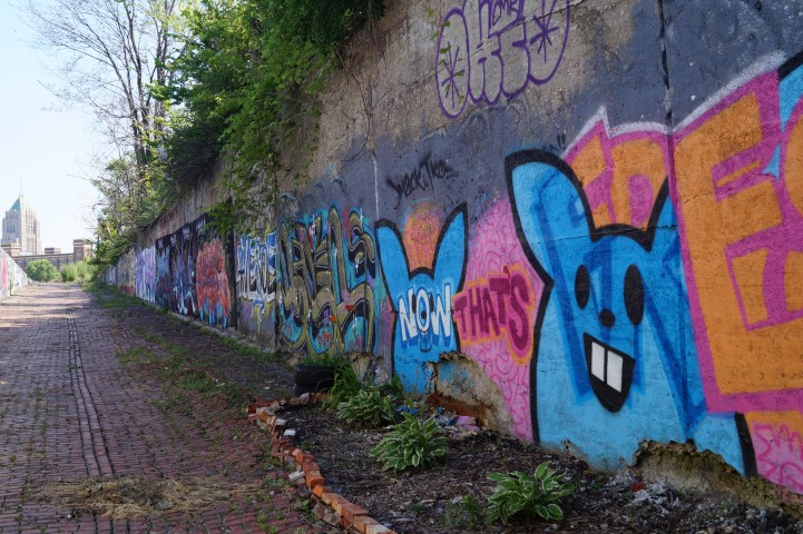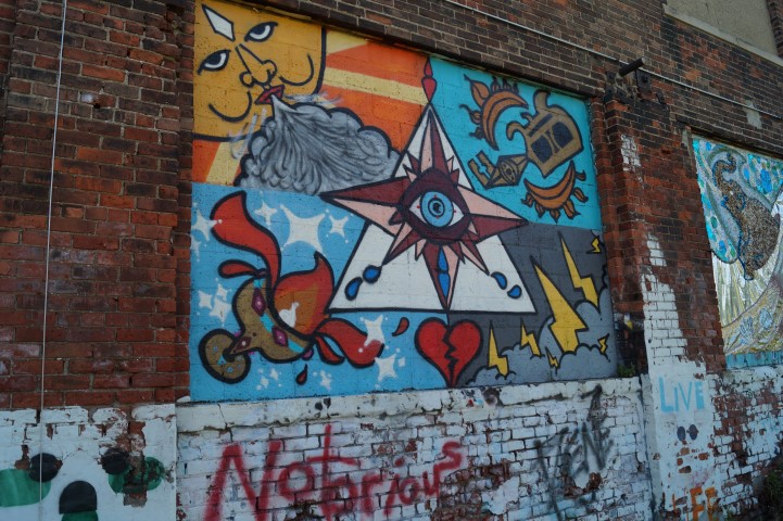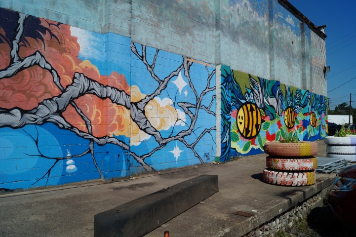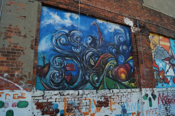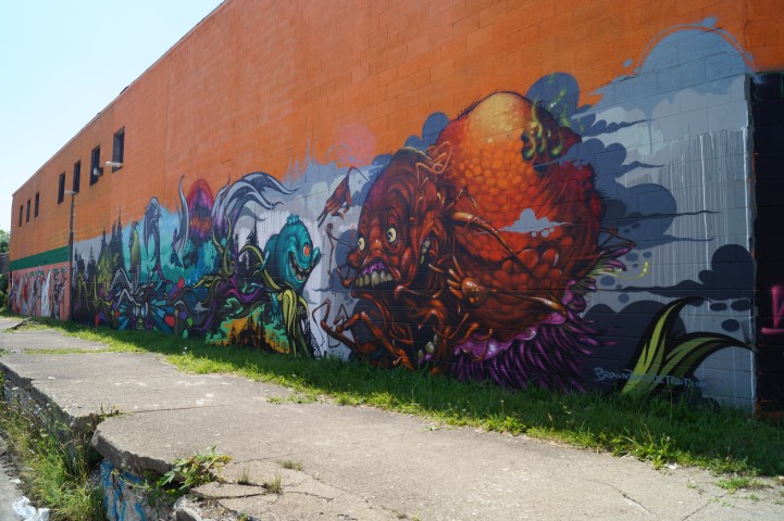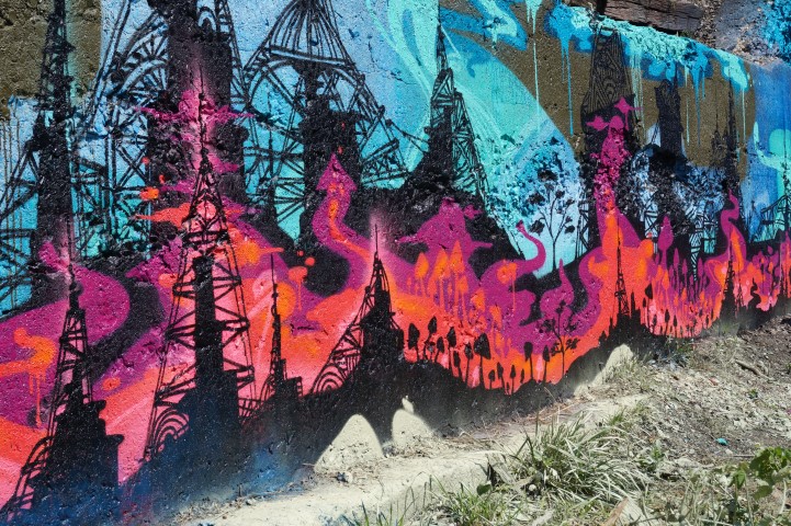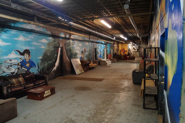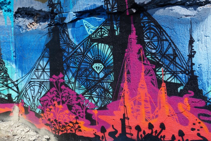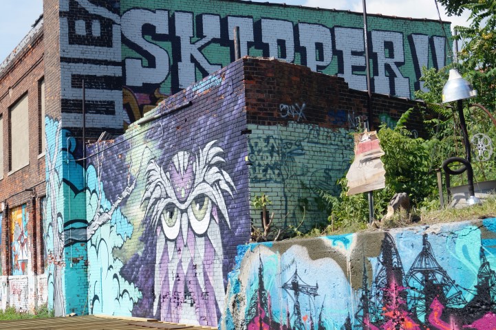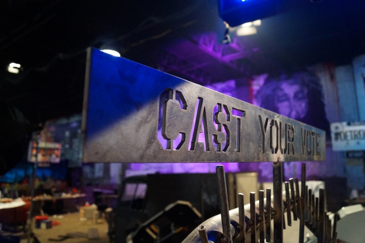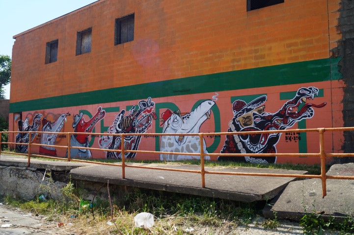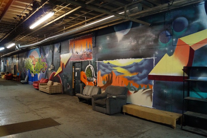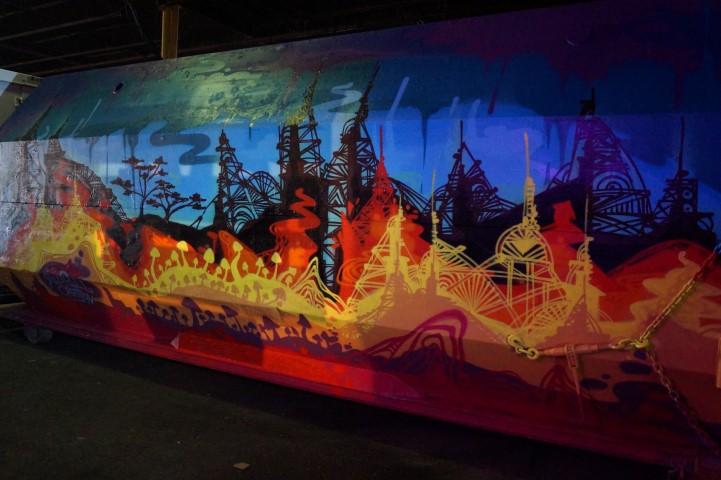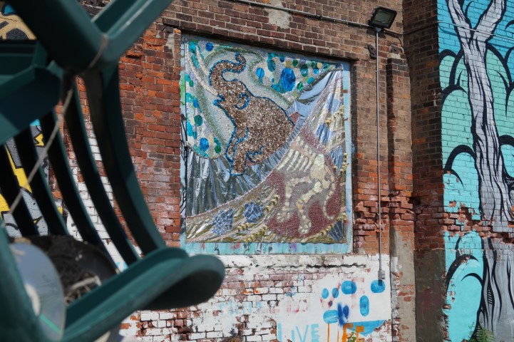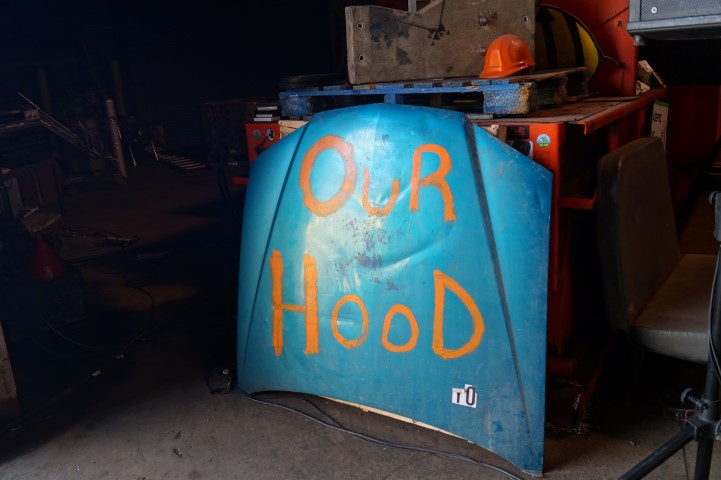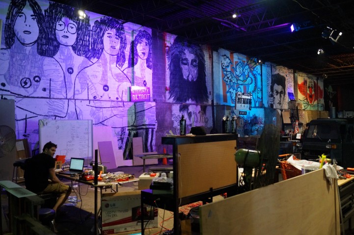 Recreating the Detroit aesthetic through communal art. This giant wall of steel is lit from behind. In order to turn the lights on, you have to pedal one of the stations to generate the electricity.