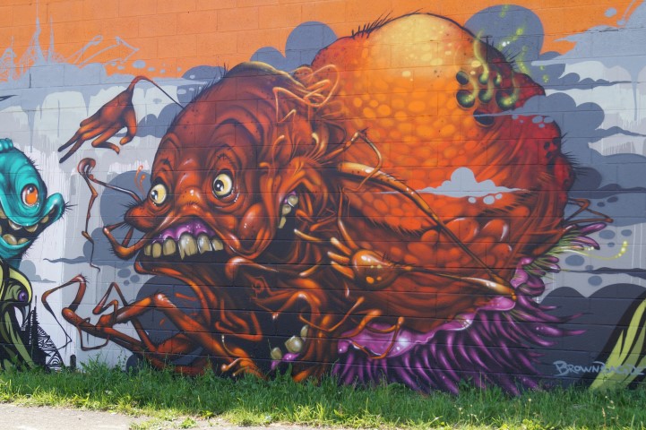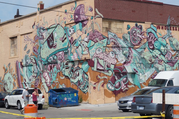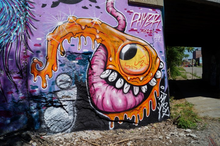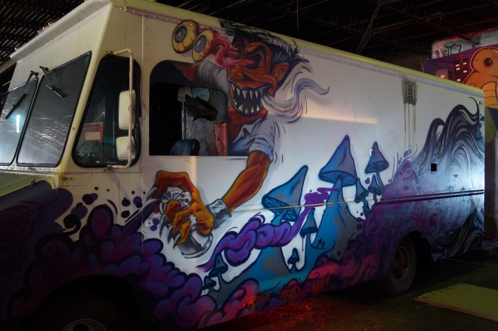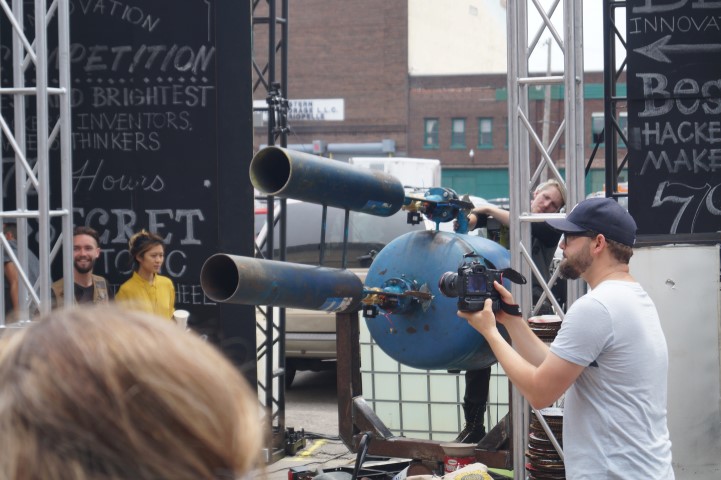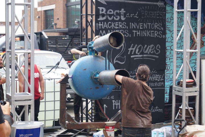 Public service mixed with a dash of mischief. This double-barreled air cannon could be used to spray the roads with salt. It could be used to plant seeds in unused fields which are surprisingly common in Detroit. We saw it launching candy and stuffed animals over crowds of onlookers.