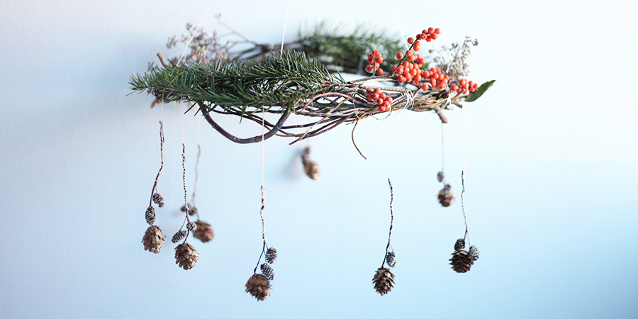 Change up your traditional wreath for a suspended fall wreath moment to bring some natural whimsy to your holiday decor, as shown by Creative Bug.