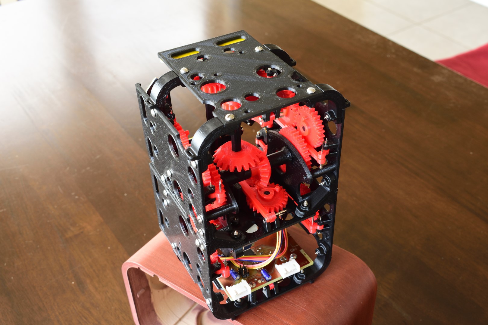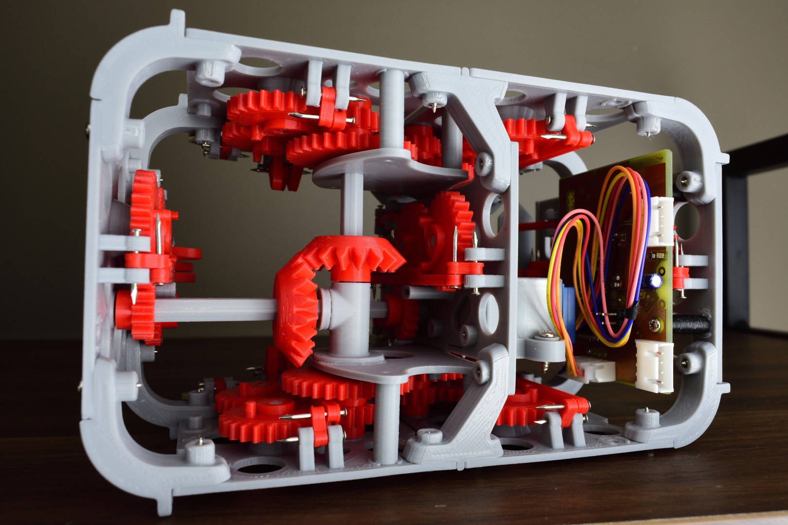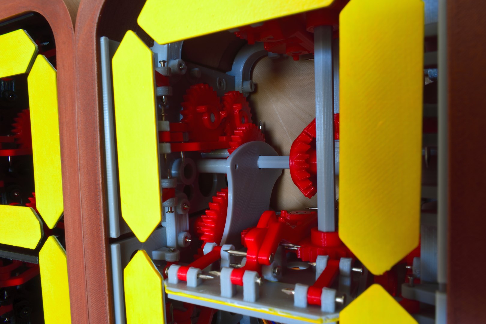 I designed, printed, and tested a single segment first. It’s a relatively simple concept. The segment needs to cycle through 10 states; while it’s being actuated each state should be held for as long as possible before flipping over to the next. The states are encoded as knobs on timing gears, and these are different for each segment. A bi-stable spring helps with a crisp flip between states. Also, the segments “fold away” — instead of just rotating 90 degrees, they hinge around two pivots to hide the yellow display surface against the wall of the case. The entire CAD was done in Fusion 360, and everything can be printed with a standard FDM 3D printer.