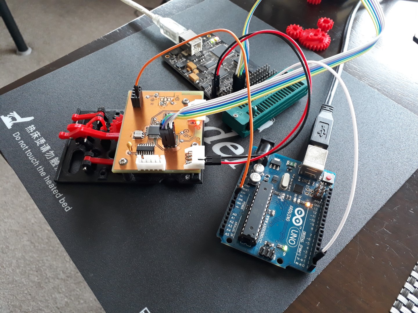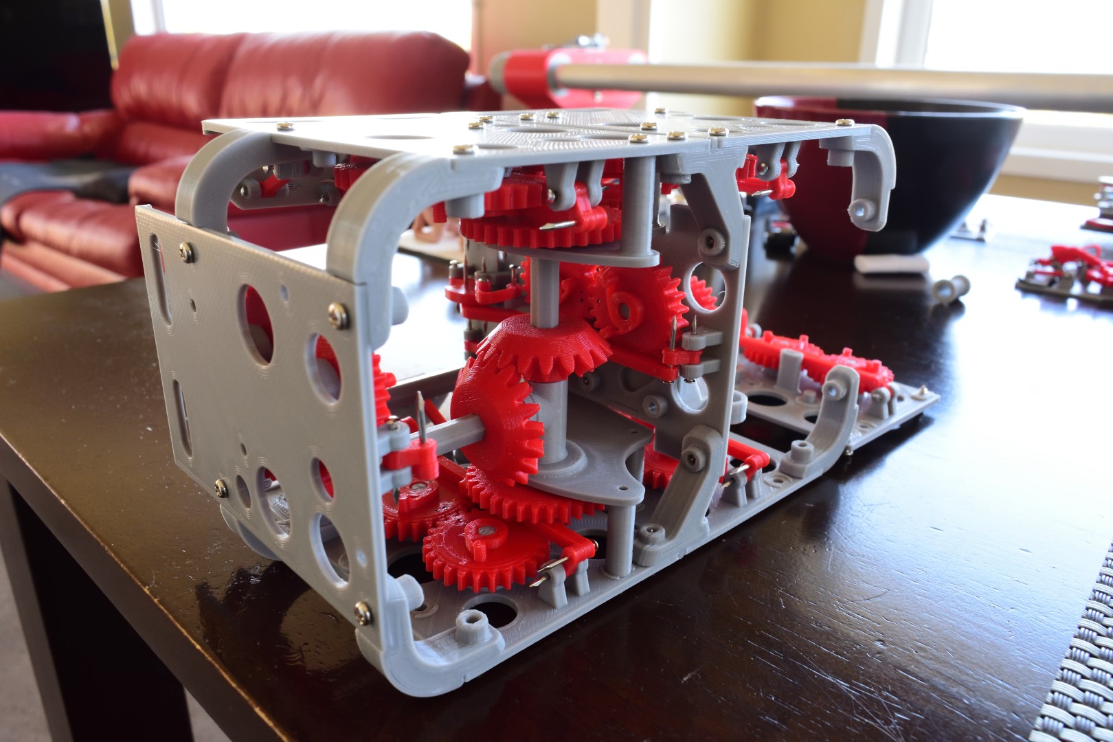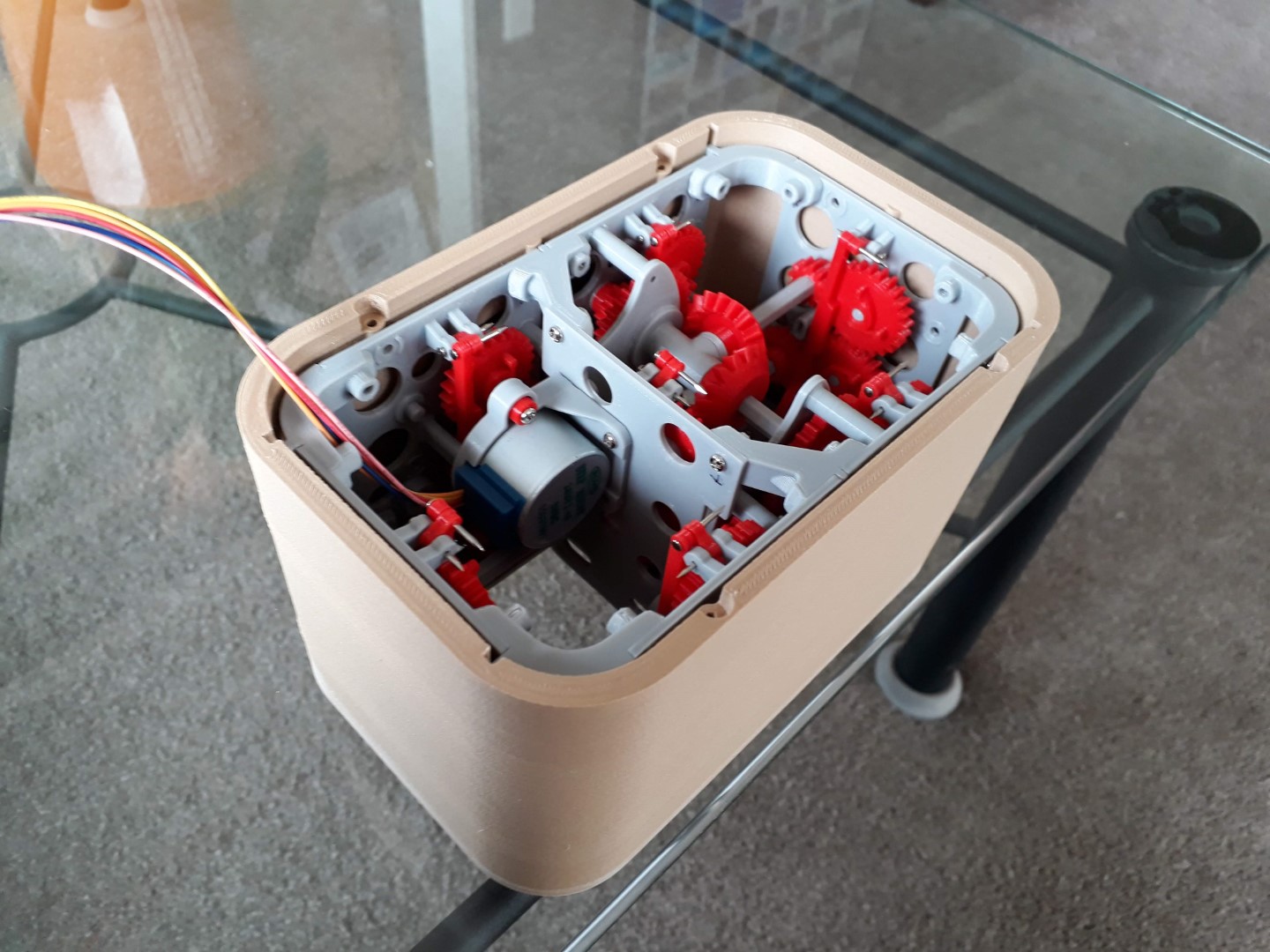 I designed, printed, and tested a single segment first. It’s a relatively simple concept. The segment needs to cycle through 10 states; while it’s being actuated each state should be held for as long as possible before flipping over to the next. The states are encoded as knobs on timing gears, and these are different for each segment. A bi-stable spring helps with a crisp flip between states. Also, the segments “fold away” — instead of just rotating 90 degrees, they hinge around two pivots to hide the yellow display surface against the wall of the case. The entire CAD was done in Fusion 360, and everything can be printed with a standard FDM 3D printer.