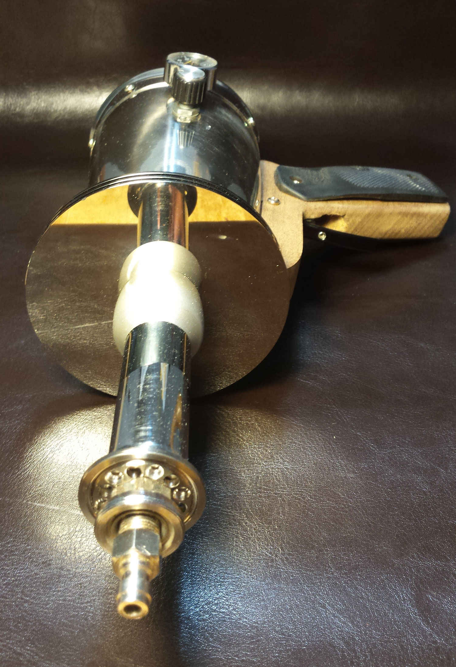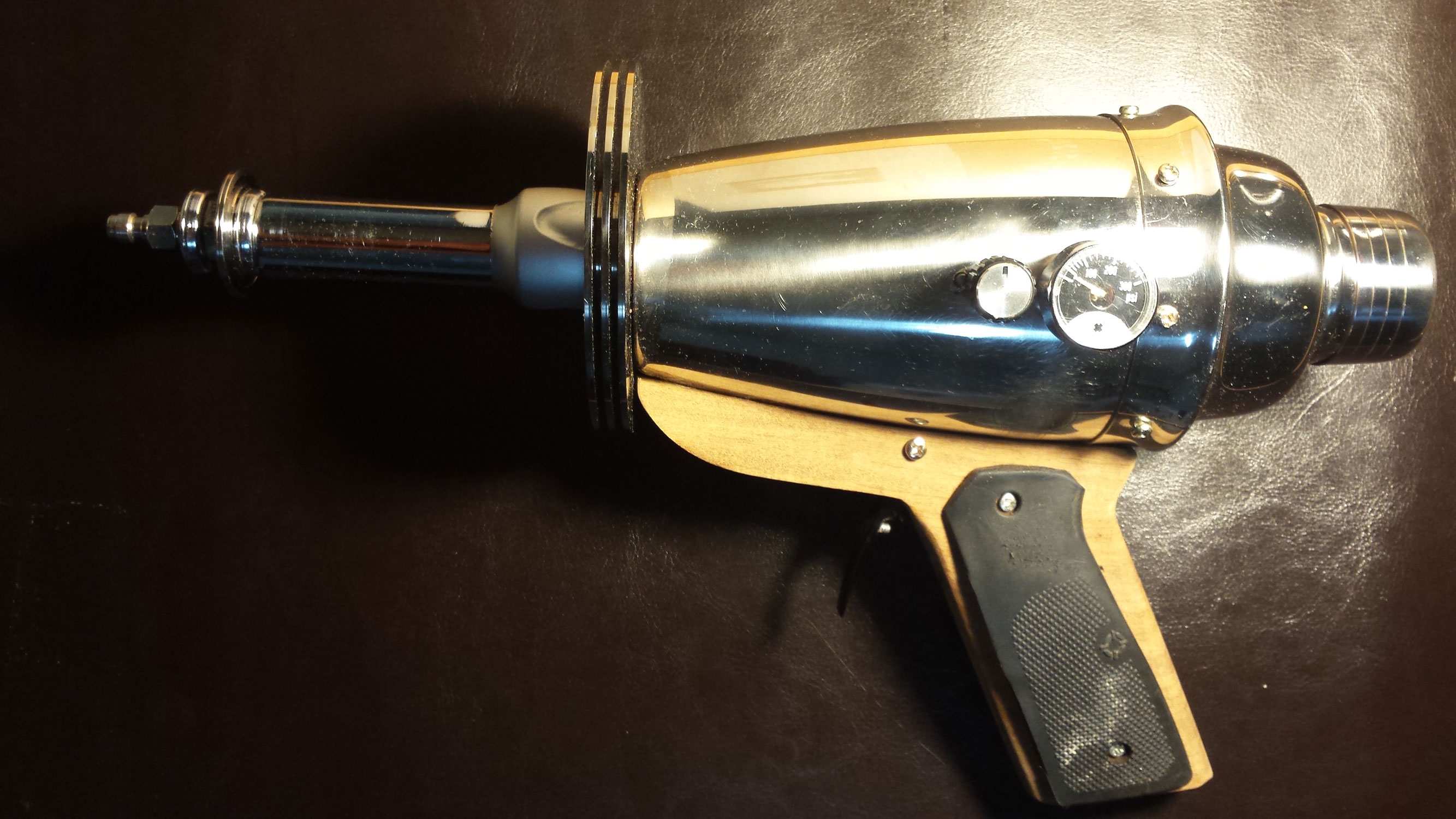 There are some additions I still need to make. The knob and trigger are both functional electronic components. They will eventually be wired into some kind of cool ray gun sound maker. I also want to replace the stainless top of the drink mixer with a glass bubble containing some interesting found-object electronic parts. Finally, I need to fabricate an appropriate display stand. But those can wait for a while. For now, my kids and I are just having fun running around the house with this thing going “pew pew”.