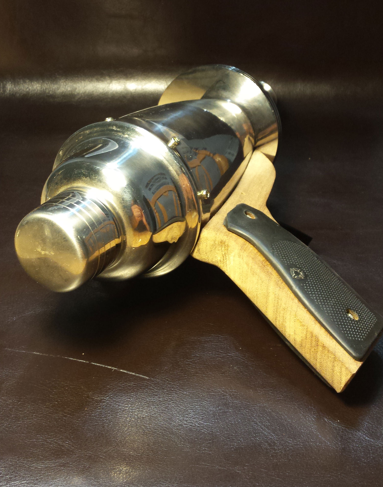Also very challenging was ensuring the curve at the top of the walnut grip and lower receiver (housing the trigger) matched the curves in the drink mixer. The drink mixer has a double curve. The first is longitudinally from the top of the mixer to the bottom. The second is the radius of the drink mixer. To make this even more challenging, the drink mixer curves change both in the top-to-bottom curve and in a smaller radius closer to the base. To ensure the parts mated with no gaps, I first made a paper template in card stock, trimming it until the top-to-bottom curve matched. I then traced the template to the walnut and cut it out. I then had to “dish” the upper surface of the walnut using a rotary sanding drum in a dremel so that the mating surface of the walnut matched the radius curve of the drink mixer. Sanding the walnut to match probably consumed the most time on this project.