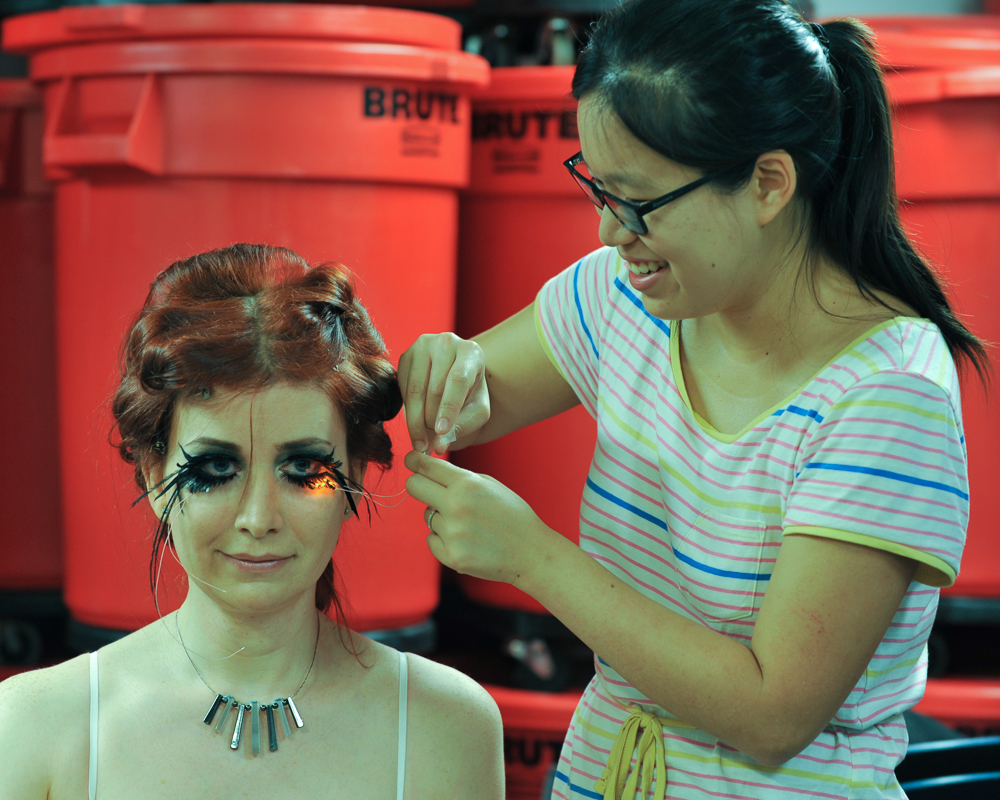 So Diana pulled in makeup artist Jessica Jade Jacob, whose specialty is special effects makeup for zombie movies. Diana explains, “We’ve long been talking about a collaboration for LED make-up in prosthetics with a fashion twist. When Gareth asked me to style the Makeys, it seemed like the perfect opportunity for me and Jessica to make our collaboration.” She continues, “We prepared most of the prosthetics ahead of time. But it’s always crazy the day of the event because the looks take a long time to achieve, so Jessica invited to Suki Tsujimoto to help style the hair.”