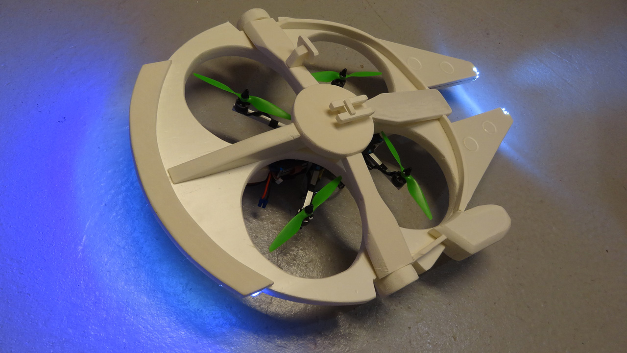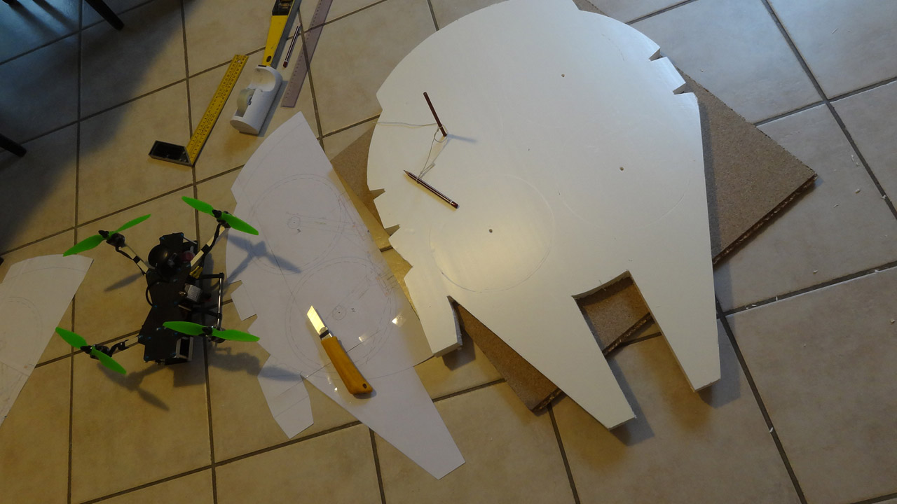 A few months ago, the Star Wars references were strong about French quadcopter videos. Now, Olivier C has taken it literal. Olivier built a skin for his custom DIY “Prophecy 335” drone that transforms it into a Millenium Falcon clone.