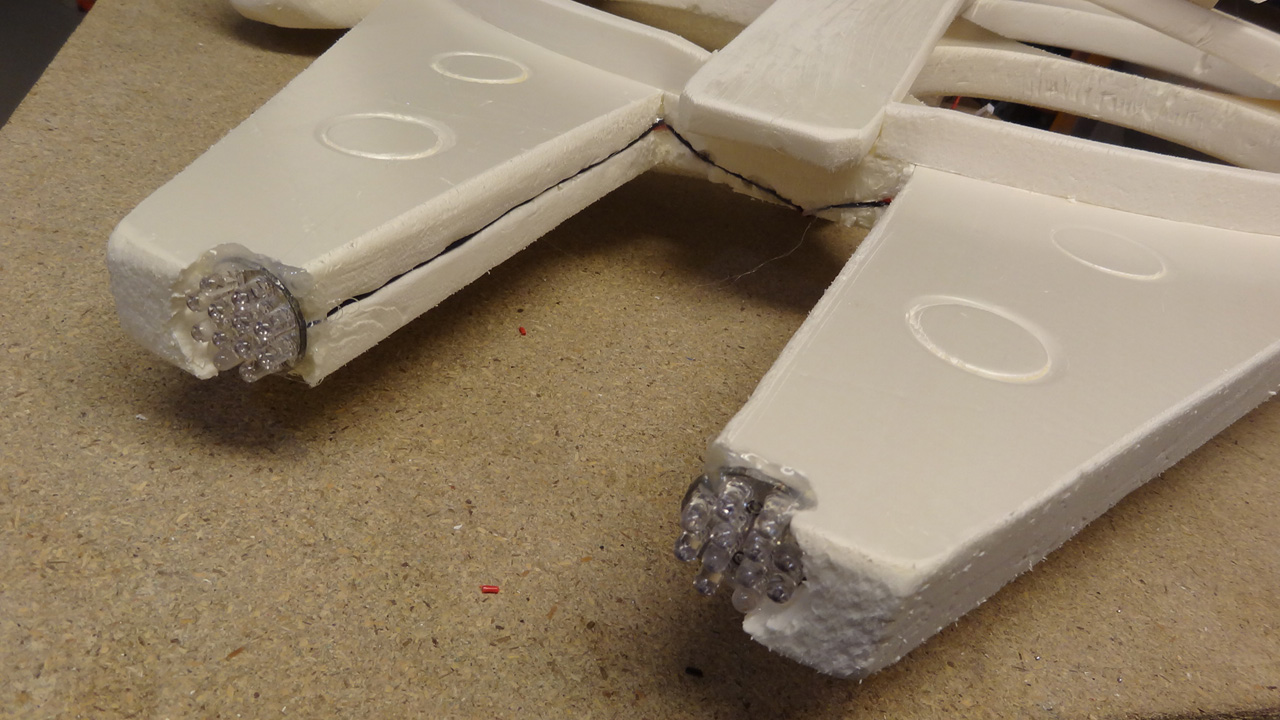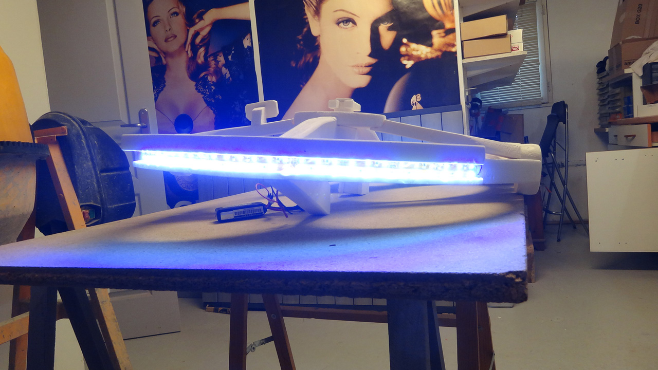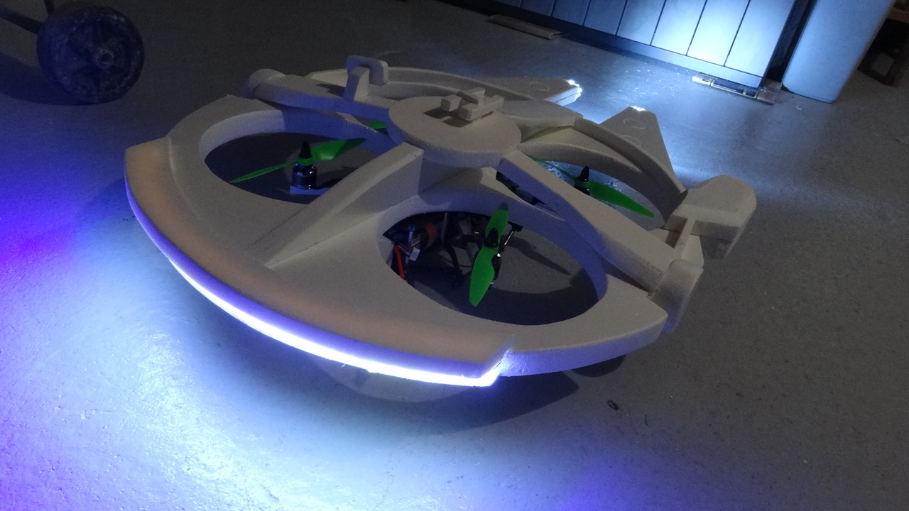 Aside from the four big holes to accommodate the props, it’s really quite accurate, even down to a glowing LED strip as the rear thruster. Olivier has detailed build instructions for both the Prophecy and the Falcon on his RCGroups.com page.