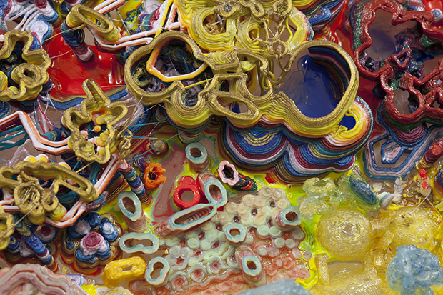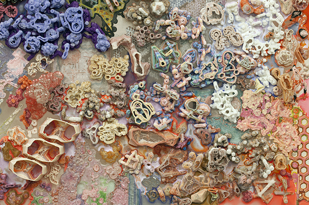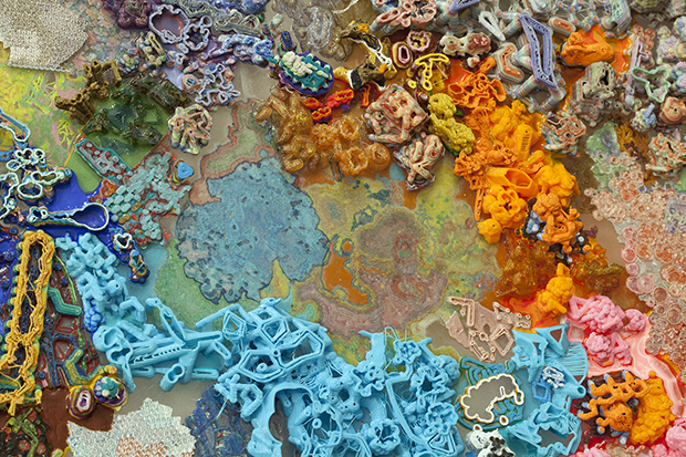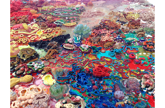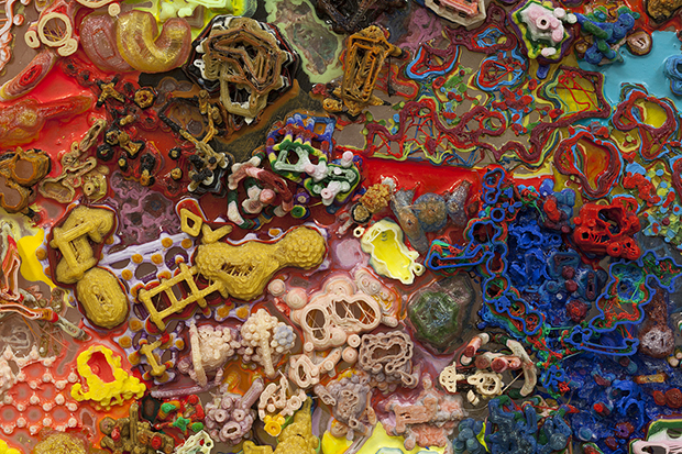 Working in the MAKE office, I come across a lot of 3D printing remnants/mistakes, many of which are beautiful by themselves. The details of this artwork are reminiscent of those 3D printing remnants, if they had personalities and started grouping together socially. It’s an interesting fusion of digital glitch and organic form.