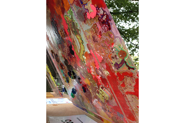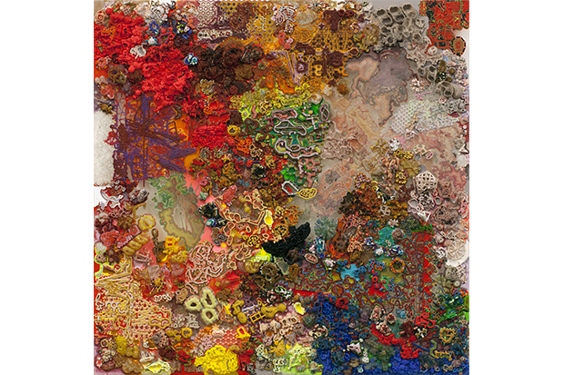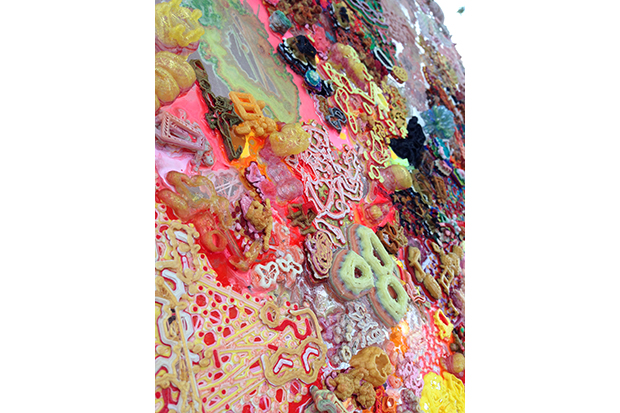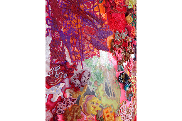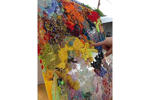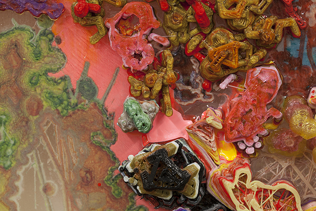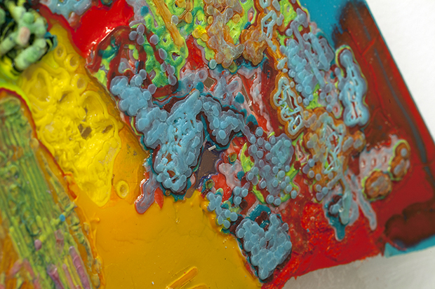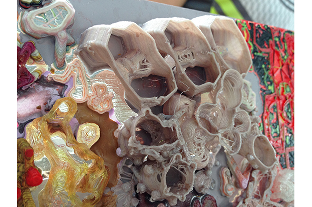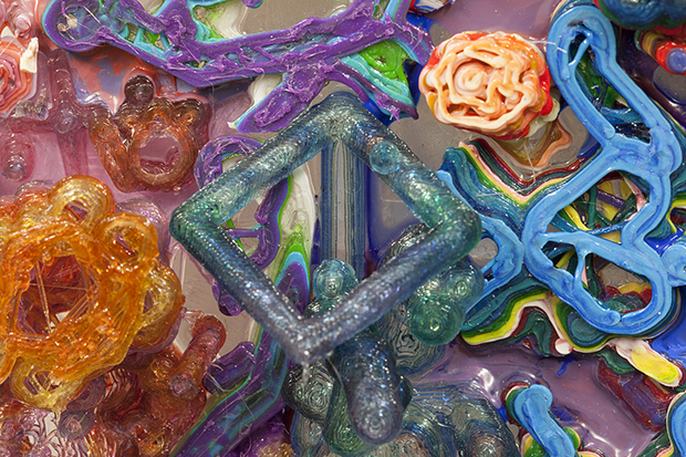 Shane works on acrylic, printing nanoscale 3D forms that have been modified by script algorithms he wrote himself. Then he paints on the acrylic a bit, and then prints some more. He also prints on the back of the acrylic, and that can show through, where the acrylic is unadorned on the front. Shane describes his process:
