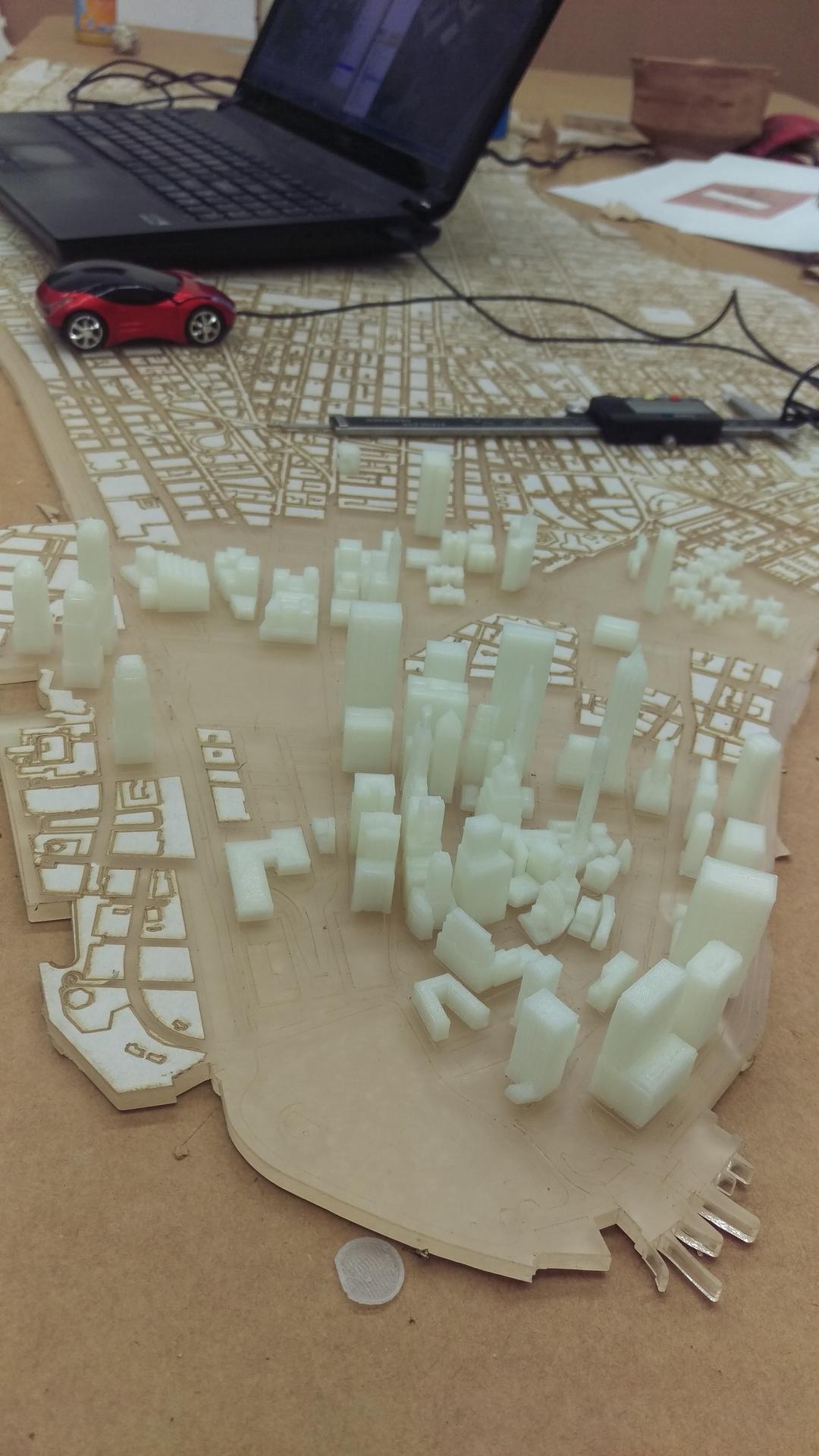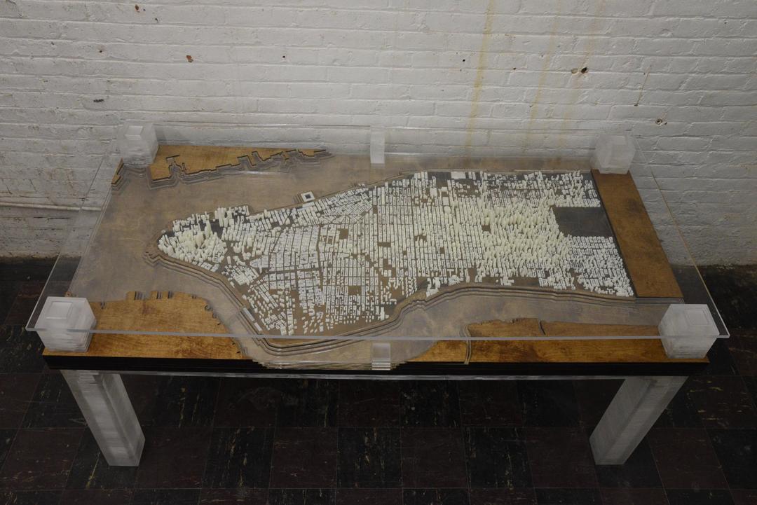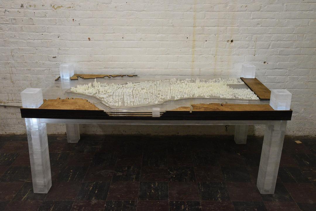 Using GIS information, Huang created all the files needed to laser cut a map of Manhattan and 3D print all the buildings to scale. After seven weeks of troubleshooting file problems, laser cutting acrylic, 3D printing buildings, gluing, gluing, gluing, and constructing the rest of the desk, Huang finally finished. The city that means so much to Huang now rests under a sheet of glass. The big apple makes for a big desk.
