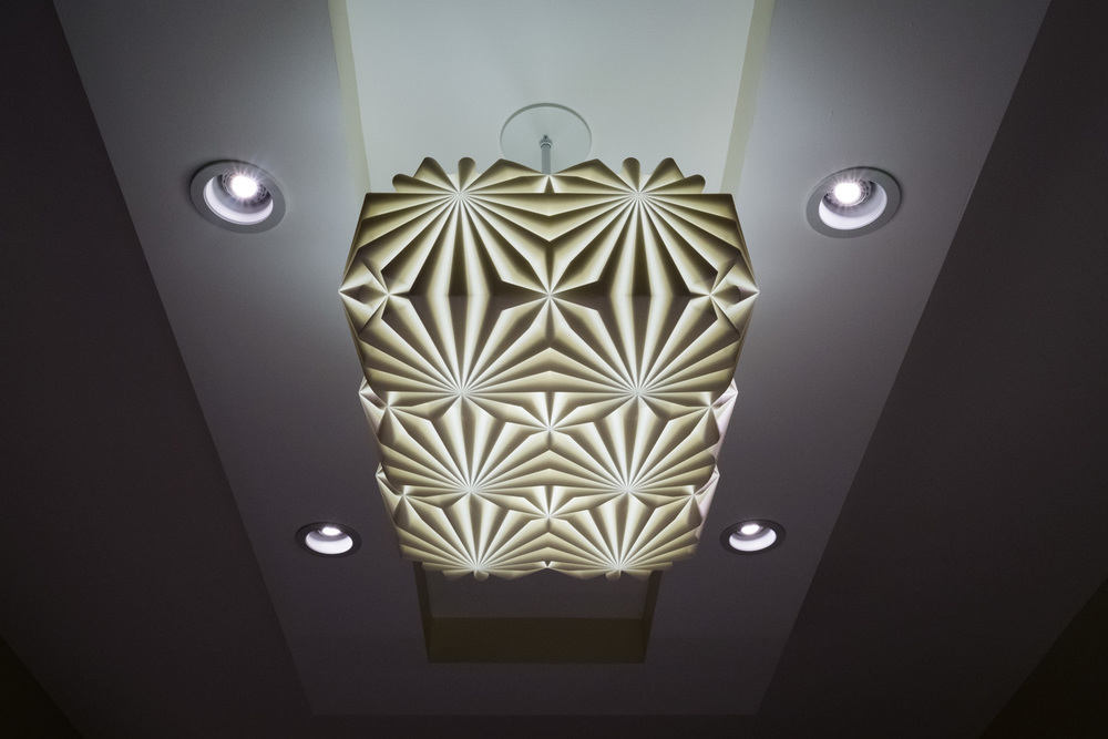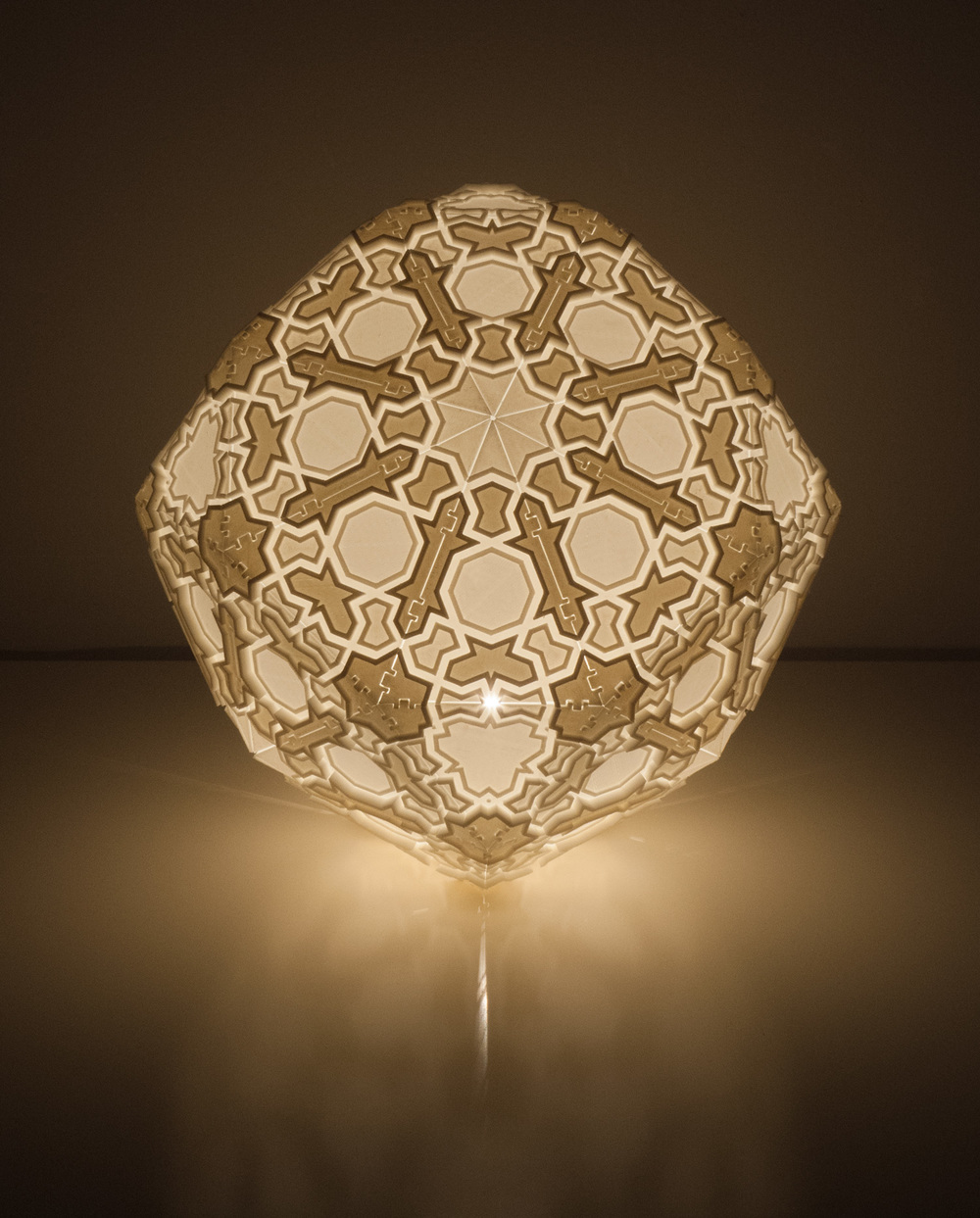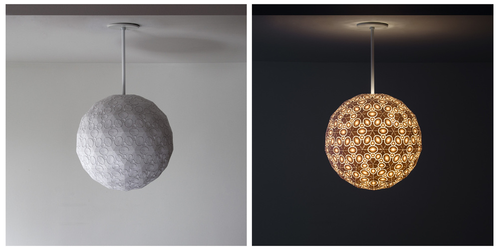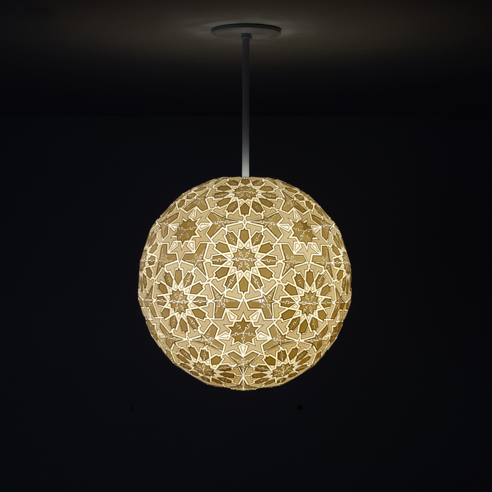 Taking inspiration from Islamic tile patterns, forms found in nature, and images of outer-space, subjects Debbane has investigated through his artwork, the designs have a sculptural quality when unlit reminiscent of ancient relief sculptures. When turned on, the geometric patterns are revealed in a surprising and dramatic way.