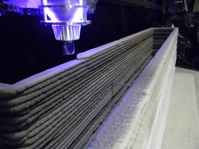 As you can see in these pictures, it looks like it works just like your standard desktop printer, though occasionally he has been adding a bit of rebar to help reinforce the structure. He says that the next time it would be nice to print all of the pieces in place because moving the turret bits that he printed elsewhere was very difficult.