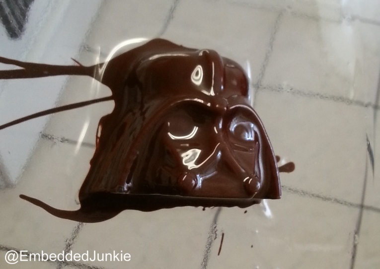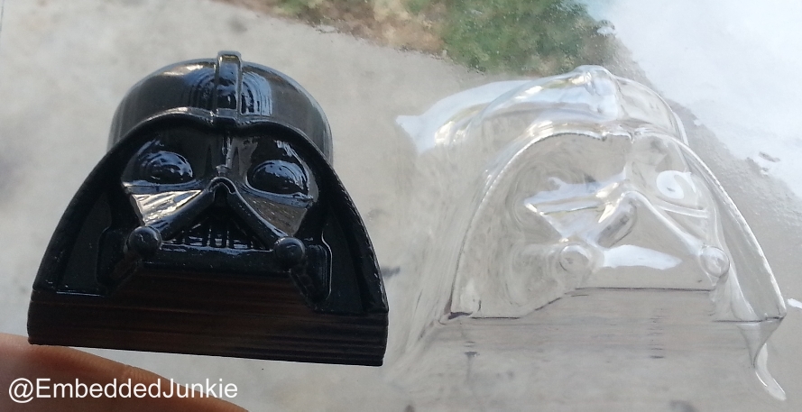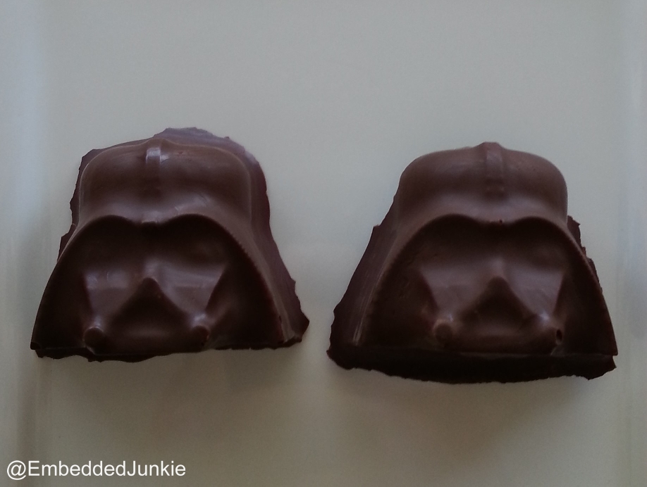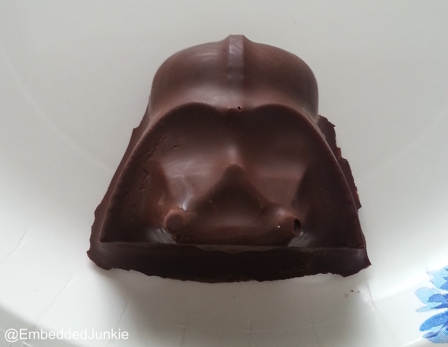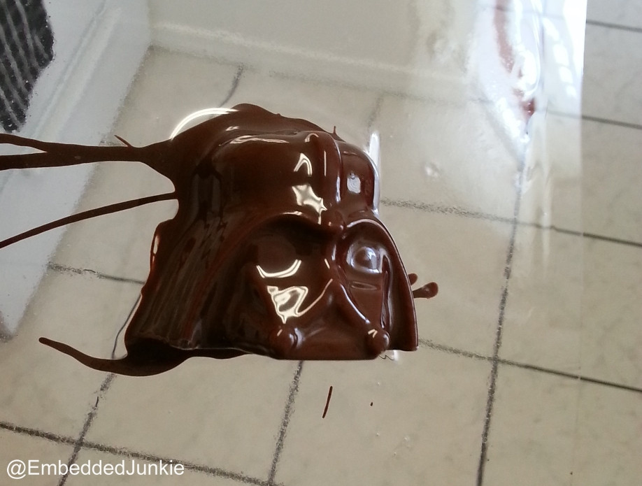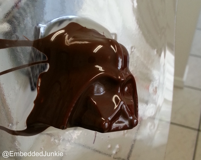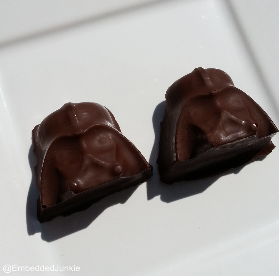 Juan Gutierrez does all kinds of 3D printing art, vacuum forming, and various interesting home manufacturing projects. His latest endeavor was quite tasty looking. He combined 3D printing and Vacuum forming to create a dark chocolate Darth Vader mask. He started with a 3d print, vacuum formed that to make a chocolate mold, then poured some yummy dark chocolate. His end result looks quite appealing.