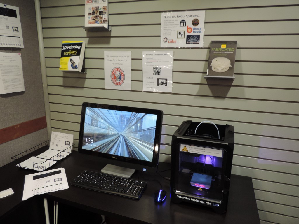 For my Project I created a 3D printing Lab in my Local Public Library. It took me about 9 months from start to finish. In that time I attendend board meetings, raised awareness, taught the public about 3D printing, fund raised almost $3,500 and built the lab and put it into the library. I also am in charge of finding volunteers to run the area because the library cant quite yet devote a staff member full time.