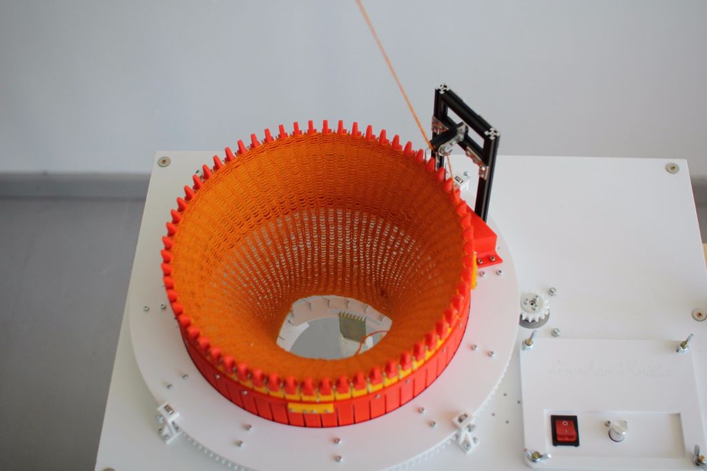Their new circular knitting machine is made from3D printed pieces,laser cut plexi,wood, and various electronic components. Since they used digital fabrication when designing and making this machine, they have been able to easily replicate this machine over and over again.