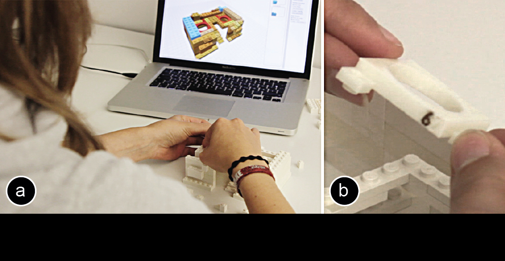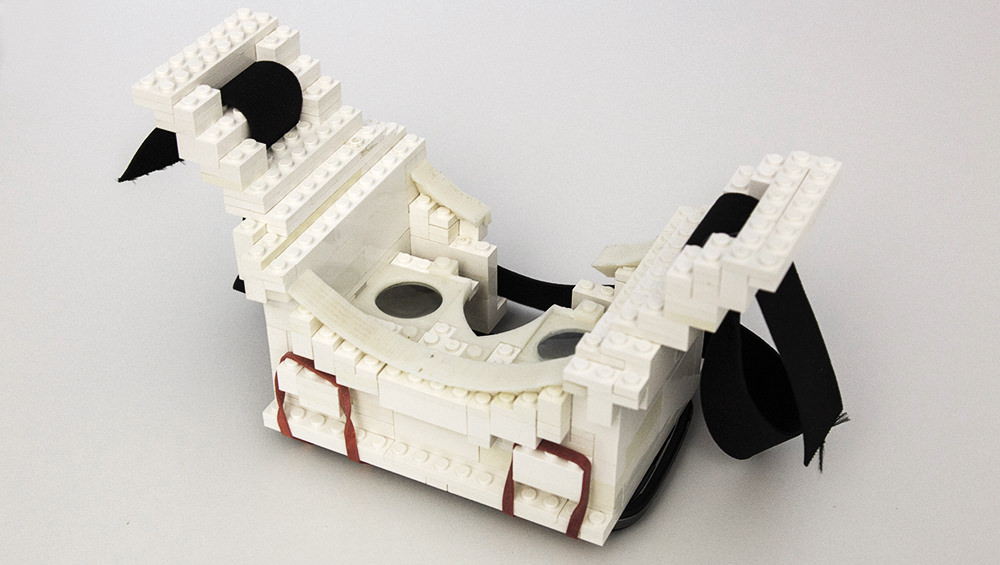 Our system faBrickator allows users to mark the lens mounts as “high-resolution” to indicate that these should later be 3D printed. faBrickator then exports these parts for 3D printing and generates instructions that show users how to create everything else from Lego bricks. The resulting faBrickated head mounted display takes 67 minutes compared to the 14.30 hours for regular 3D printing. If users iterate on the design later, faBrickator offers even greater benefit as it allows re-printing only the elements that changed. For instance, when I later on decide I need more comfortable head pieces, I can just print them and replace the bricks on the object.