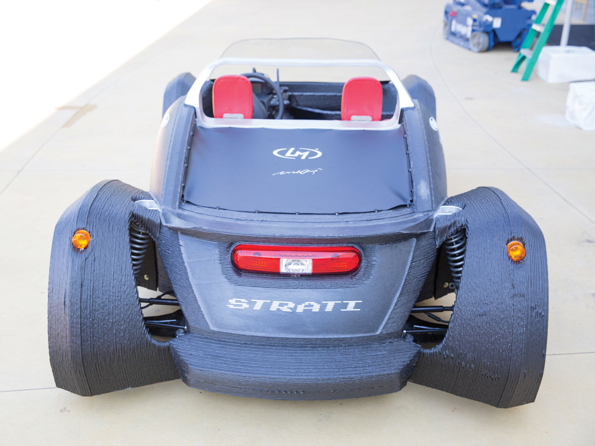 Strati was the winning entry in a competition for Local Motors community members. The designers didn’t set out just to build a 3D car, but to make cars easier to build. Their biggest target for innovation was to reduce the part count, from the tens of thousands in a typical car to just 49 in Strati’s case.