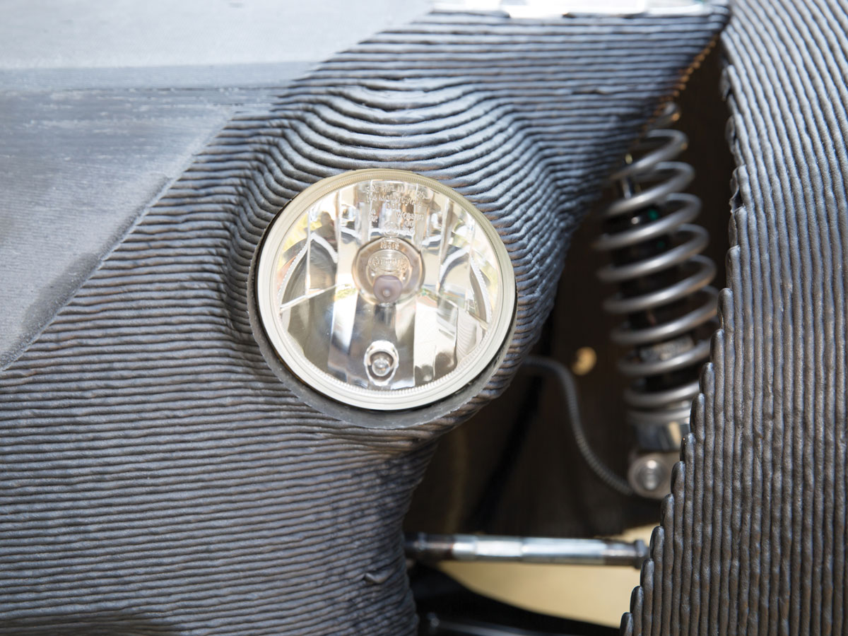 A low-riding roadster with an open cockpit and an electric motor, the Strati glides at speeds up to 50 mph. Its dark features accentuated with red seats and white wheels give it a slick appearance. What stand out most, though, are the thick horizontal layers, visible leftovers of the fused filament fabrication process that makes the car unique.