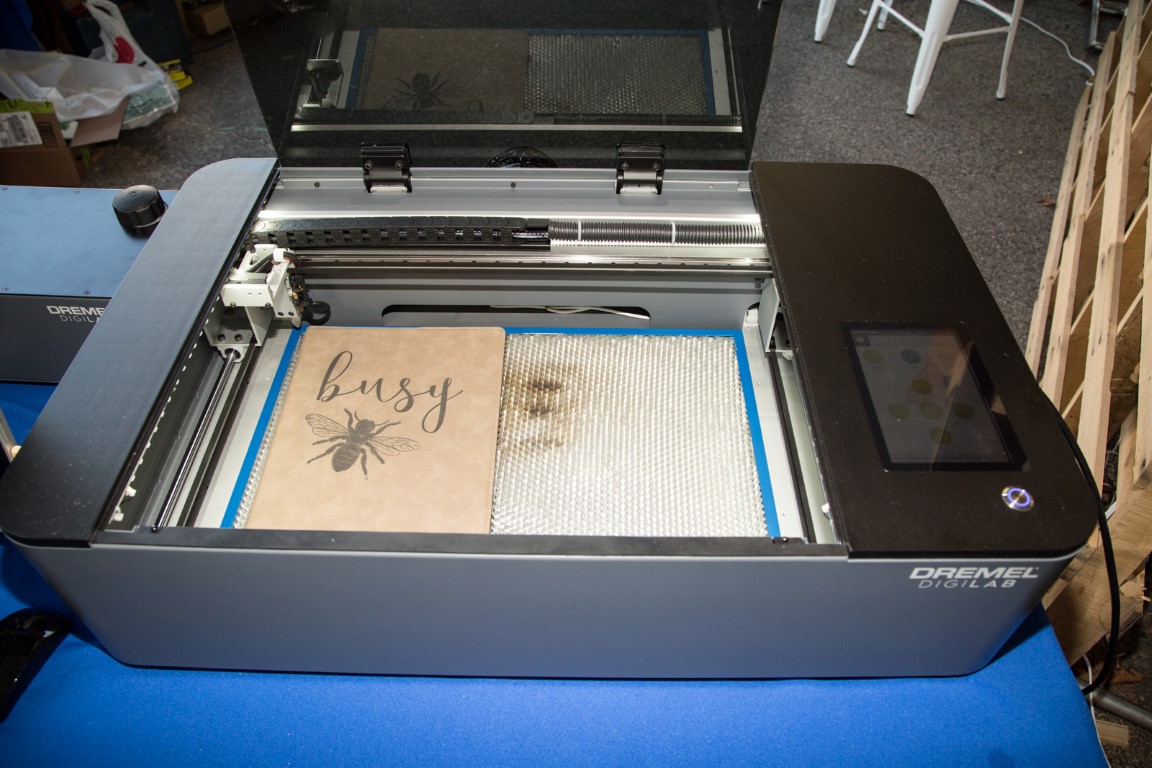 They’ve got it up and running, cutting and engraving things like wooden cutting boards and leather bound notebooks.