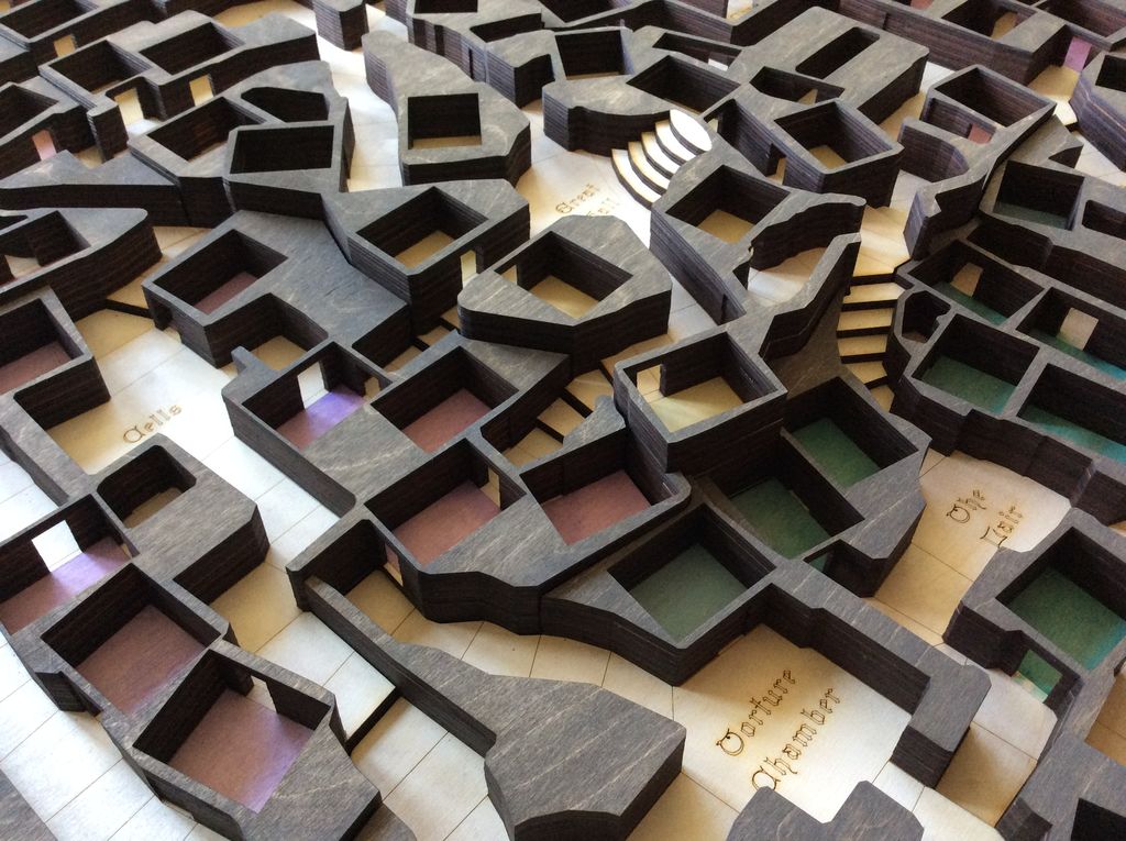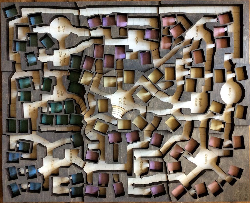 At this point, the dungeon was beginning to look like his VR model, but like his model, it was lacking in color (unless you count the laser-burned sides). He then color-coded the different dungeon levels with water color paints. Though this looks good in the pictures seen here, Campbell notes that his masking job didn’t work as well as he would have liked, and there was some bleed through.