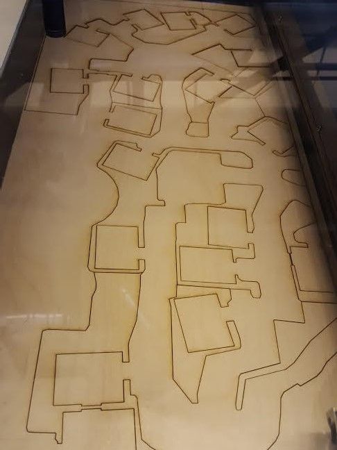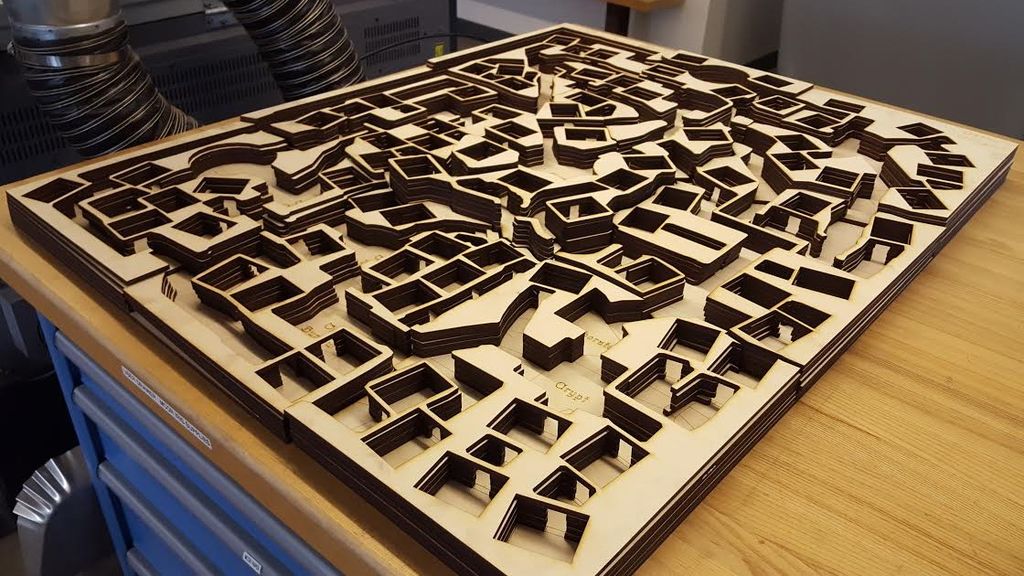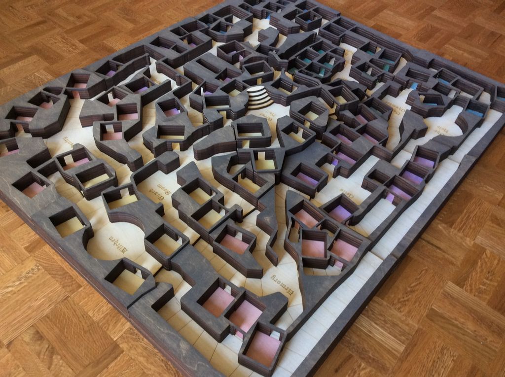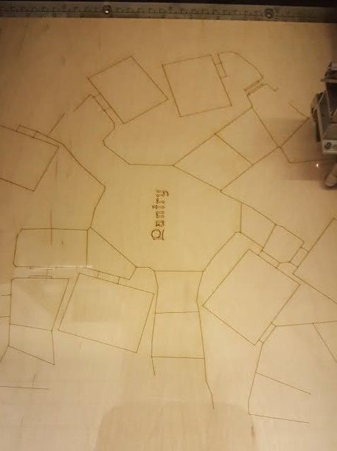 After a few minor revisions, it was time to make the cuts. Campbell, as an Autodesk employee, has access to the Pier 9 facility in San Francisco, and during a trip there (he lives in Seattle, Washington) he used the laser cutter there to produce his masterpiece. The model was cut into 9 smaller models and after 12 hours of cutting ¼” plywood, his game board was done ready to be shipped home (over 500 pieces, or 40+ pounds of plywood) for more work.