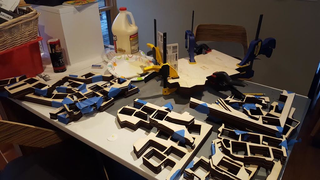 Once he got the pieces, a massive gluing job took place. As you can see in one of the pictures below, he didn’t use a mere squeeze bottle, but instead used glue out of what looks like a gallon container of the substance! This took several days, but resulted in 9 chunks of wood/dungeon, with plywood stacked in different configurations to represent the dungeon’s 6 levels.