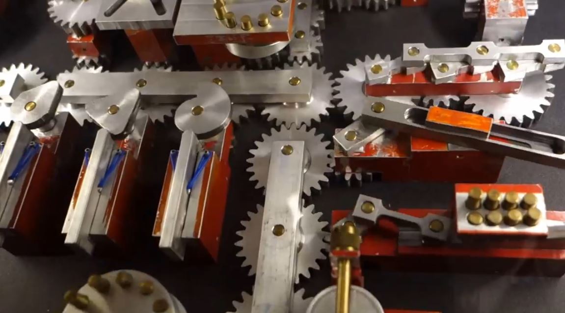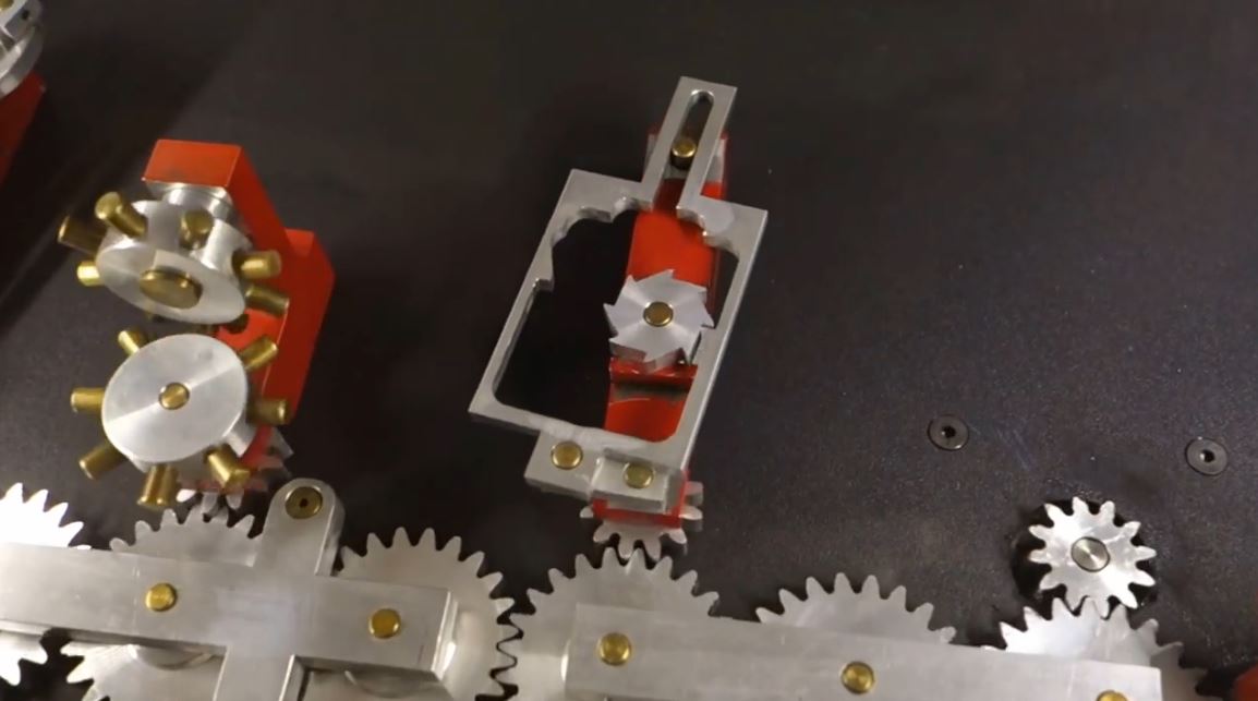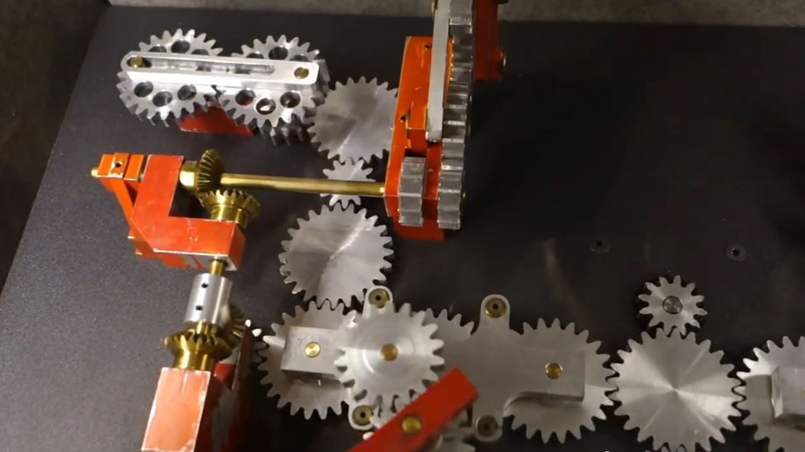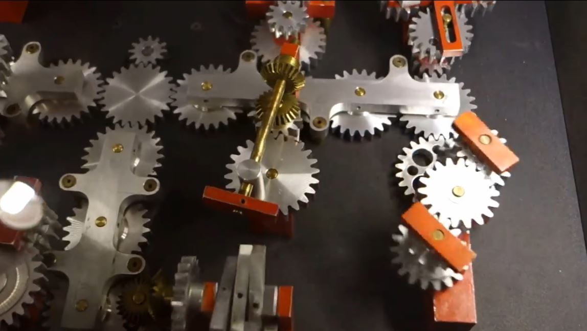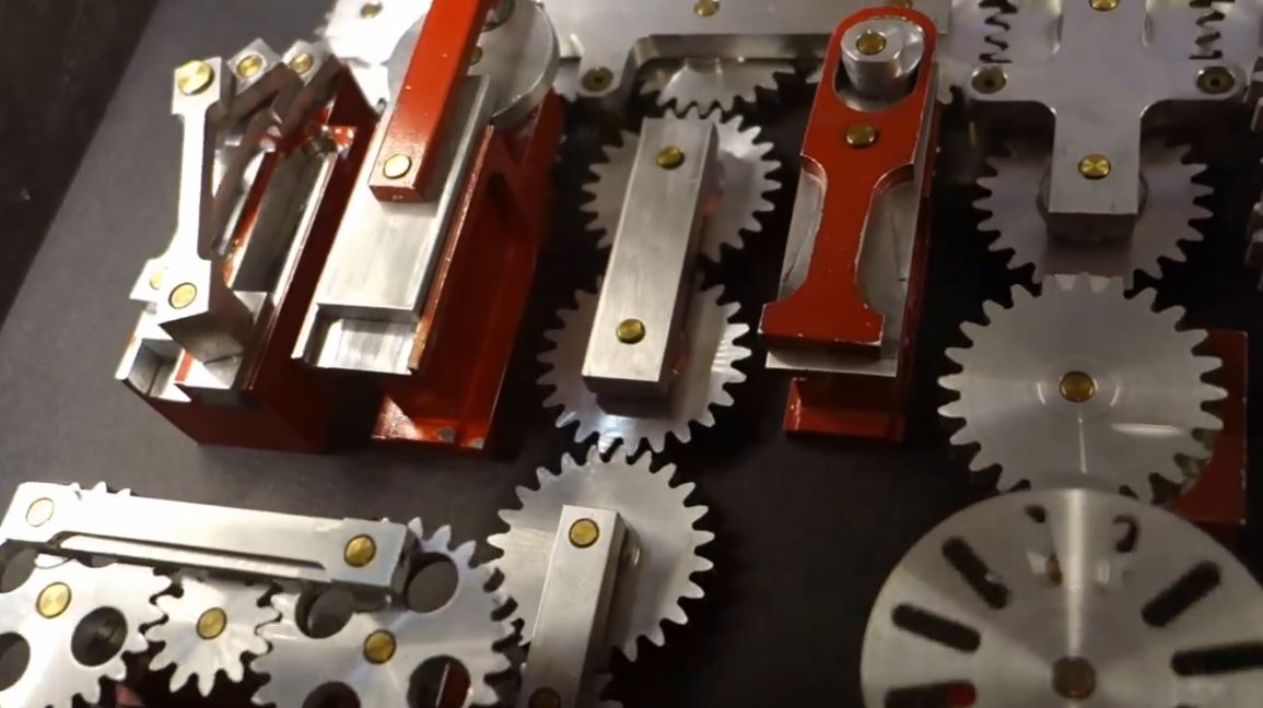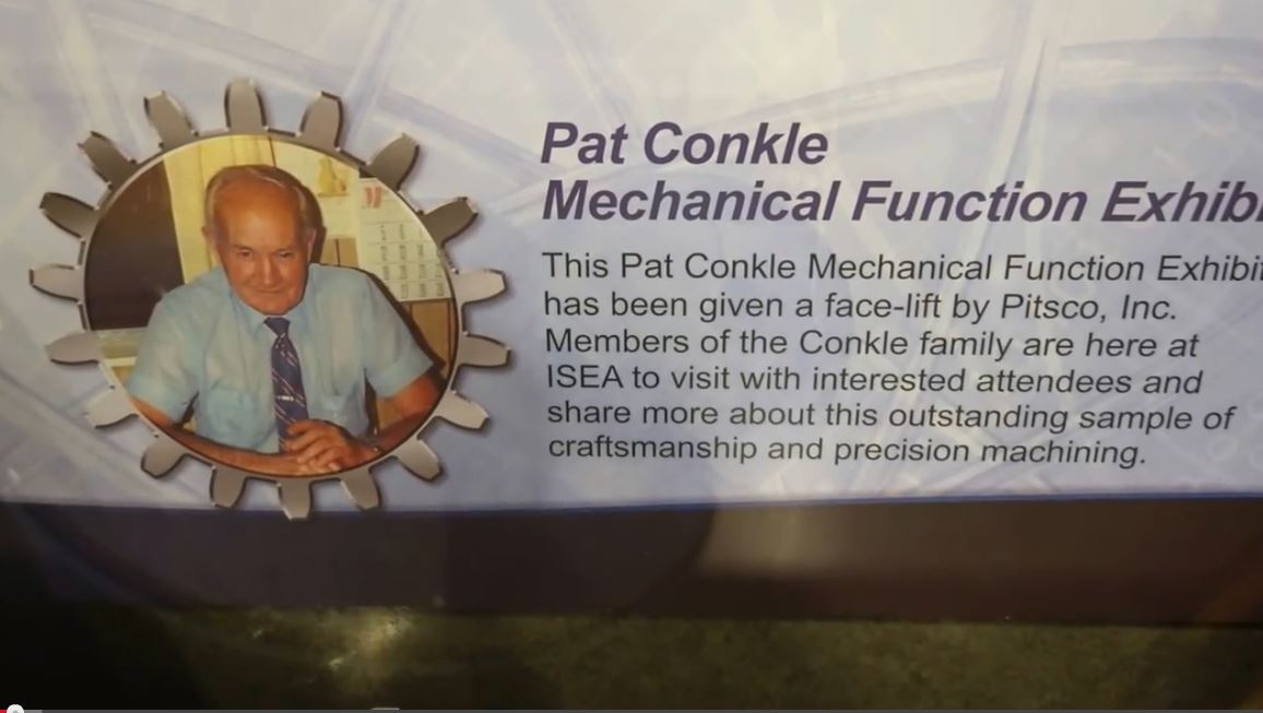 Pat Konkle, a retired machinist from Colorado, created a set of mechanical displays that demonstrate a variety of working gears. It’s an amazing piece of work. Mike Neden of Pittsburg State’s Kansas Technology Center came upon these displays on a trip and with help from Pitsco Education turned them into freestanding exhibits. Mike said that Konkle created these displays in his machine shop as his wife’s health was failing. He brought a comfortable chair into the machine shop for her and she sat there while he worked away on creating these marvels of mechanical motion.