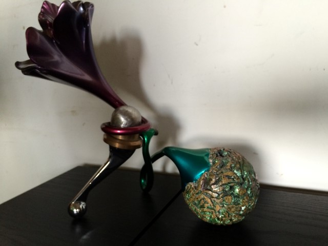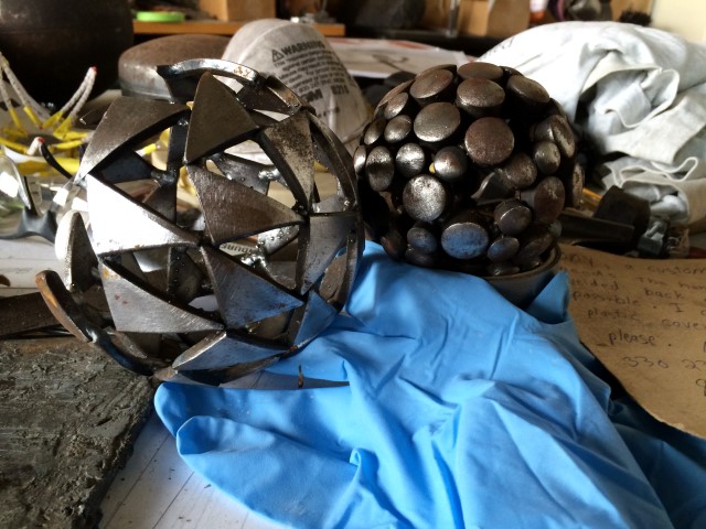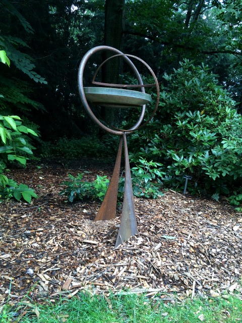 My academic background in formal design enables me to create works both large and small. Over the span of my artistic career, I have developed two main bodies of work. The first includes smaller, more precious objects that incorporate elements of nature and the man-made. The second is a series of works at human scale. Some combine celestial models or compasses with the human form. Most are abstract, steel, and rusty brown: homage to my rust belt town. A branch of my work includes motorized sculptures: one is based on a carnival tea cup ride. The others use motors to spin bowling balls for various effects. I like to instill in my work a sense of play, movement, triumph of the human spirit.
