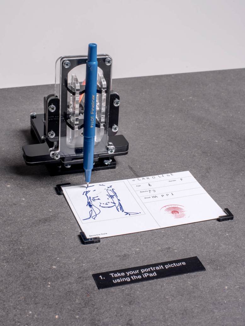The user takes a selfie with an iPad, which connects to a Raspberry Pi via Dropbox. A Python script then takes the image and uses openCV to convert it to a line drawing, which is then performed by the drawing machine. In the next step of the exhibit, the user sends an email. This prompts the Pi to send your photo to Rekognition, an online facial and concept recognition service which determines your gender, age, mood, and how beautiful you are (measured as a percentage). This information is all stored in a database, and the second machine stamps it out on your profile card.