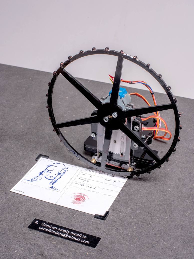 Enter Martin Hertig’s “Sensible Data,” a playfully interactive art installation designed to make us question our digital exchanges. Composed of three drawbot-style machines, the exhibit collects and then “leaks” your personal data by stamping out a profile of you on an index card. To interact with each of the three machines, all you need to do (respectively) is take a selfie, send an email, and then push a button. The machines dutifully produce a tangible record of these commonplace actions, reminding (or perhaps warning) us of the invisible hands collecting information every time we move around some bytes.
