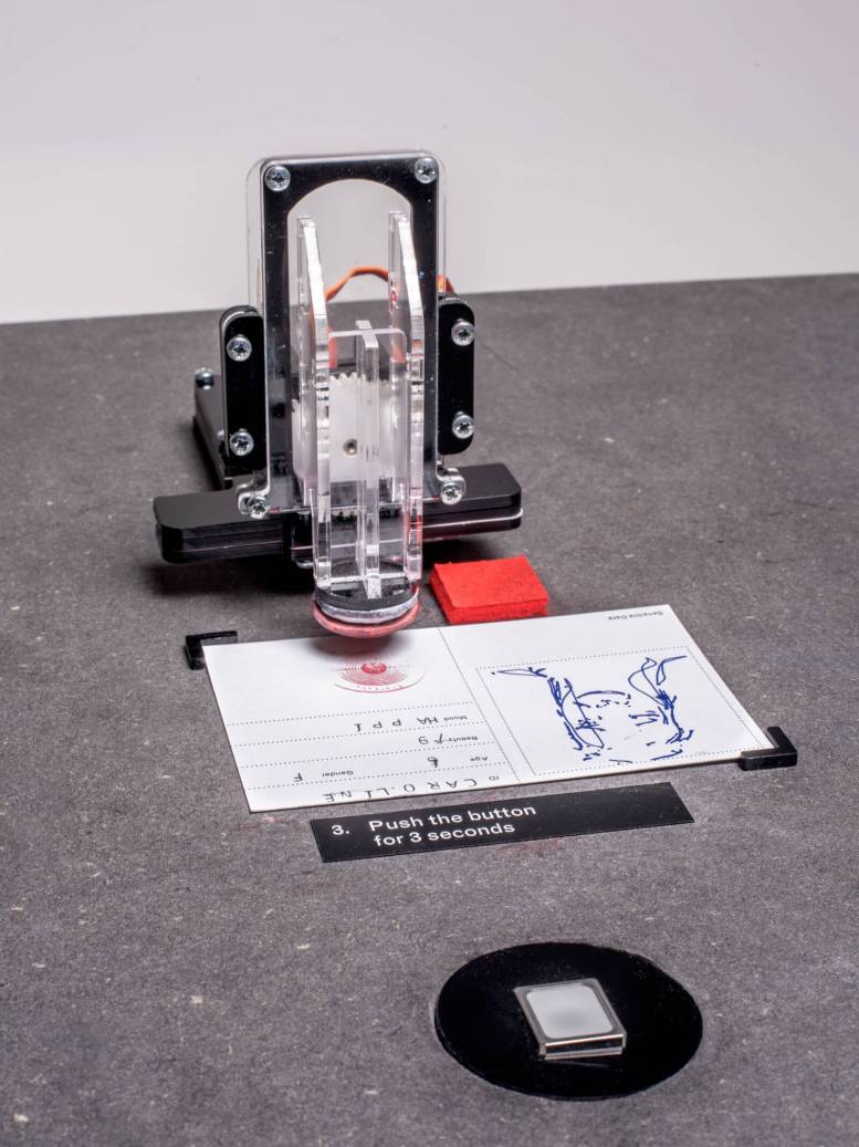 Finally, the user is asked to press a rather dubious button. It’s actually a fingerprint scanner. Once your fingerprint has been received, the third machine gives your card a stamp of validation, and you receive an email with all of the personal data of a previous user — without their knowledge.