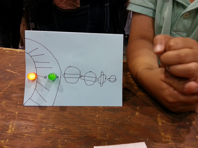 The TapeTricity Card, from MAKE pal Chris Connors, is a great first electronics project for kids. It’s quick, cheap, easy, and fun to make. Not only does it teach how to make a simple circuit, but it engages the maker’s creativity: they design and draw the card, and then they decide how many and which color LEDs to include.