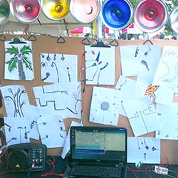 This Saturday, April 13ย at The Tech Museum of Innovation in San Jose, Jay Silver will show you how to play your drawings with Sketch It! Play It!, one of his latest inventions growing out of his work with Intel’s Start Making! initiative, as well as Drawdio, Reactable Mobile, Singing Fingers, and the ok2touch jacket. Jay will be a stone’s throw from a giant version of his mega-popular MaKey MaKey. It’s been super-sized by our friends at Lawrence Hall of Science, as seen in this picture (below) from an event at the Hall in February. Dave Merrill, co-founder of Sifteo, will delight you with those playful cubes in the picture at the top of this post. Students from the Menlo School’s Applied Science Research class will strum their stuff with a variety of musical projects they’re working on for Maker Faire. Learn more about the Featured Makers or the event.
