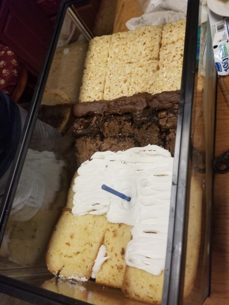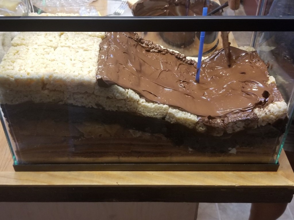 I’ve been working as a hydrogeologist for 15+ years, at the U.S. Geological Survey and at the Oklahoma Water Survey (University of Oklahoma). I have 2 kids and have made various cakes for their birthdays. A good friend of mine made a volcano cake and I wondered if a functioning aquifer cake could be made. Yes, we ate the top layers of brownie, pound cake, and rice krispie treats….it was sweet! The rain was almond milk that I colored blue with food coloring (we had some non-dairy folks in the office). The cake was a bit soggy afterward, so it was not very enticing. But, the brownies were not soggy!
