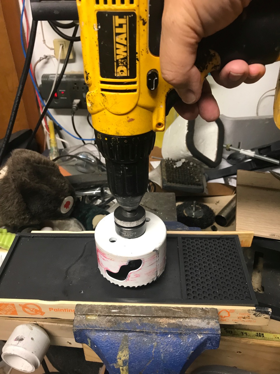 Using a dremel tool I cleaned up the inside, making room for the USB plug that powers the Echo itself, as well as to provide storage for the excess wiring and mounting holes.