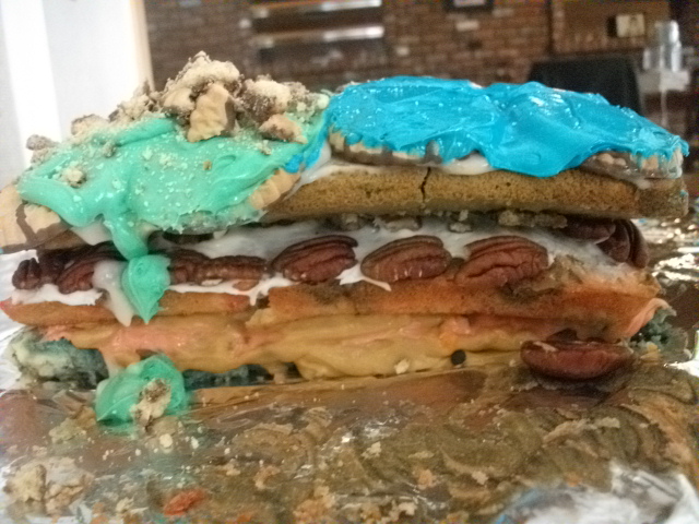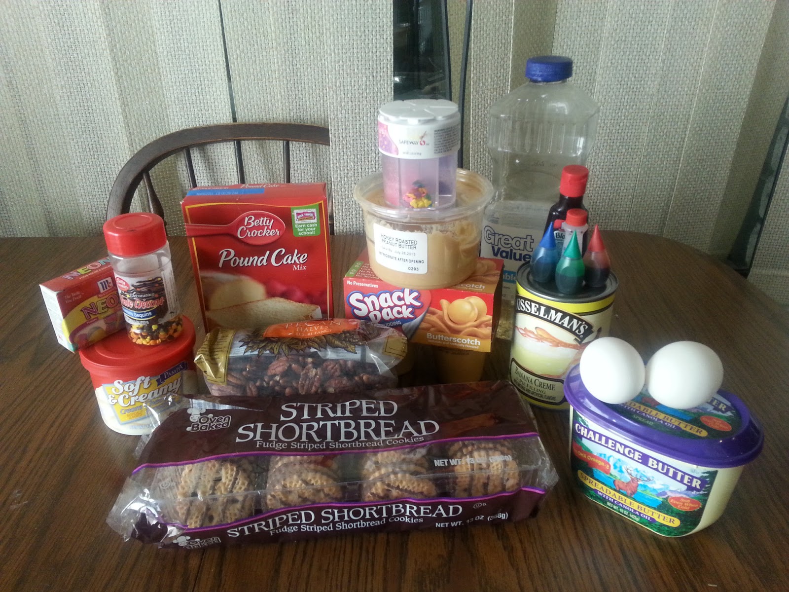 - Something to use as a liquid layer (we used both icing and butterscotch pudding)