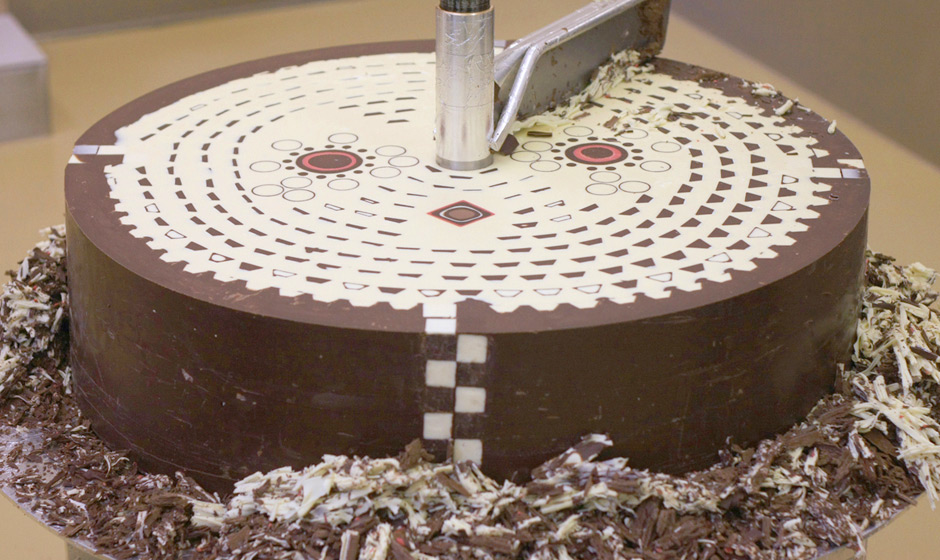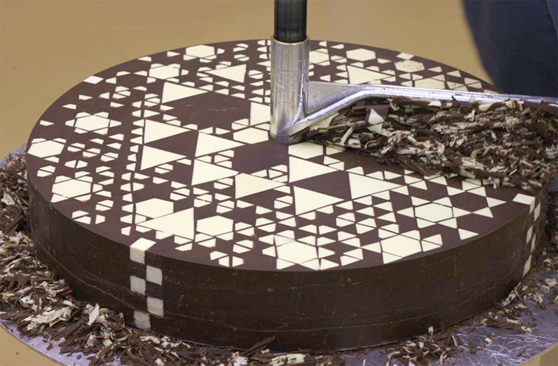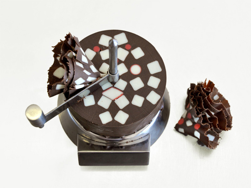 Based on concepts from the Dutch furniture designer and architect Gerrit Rietveld, the team at Studio Wieki Somers combined design and sweetness forces with chocolatier Rafael Mutter on the project known as Chocolate Mill. The vitra design museum featured the project in the confrontations exhibition to celebrate a global weakness: the sweet tooth. Using a giant cylindrical block, they carefully crafted 10 decadent layers of cocoa-based confection and filled them with flavored shapes and rosettes. They then shaved them off a little at a time using a crank-turned blade that acts similar to a cheese slicer. You can see the emerging layers of geometric patterns in the time lapse video of the shaving process. It is breathtaking, inspiring, and just plain neat.