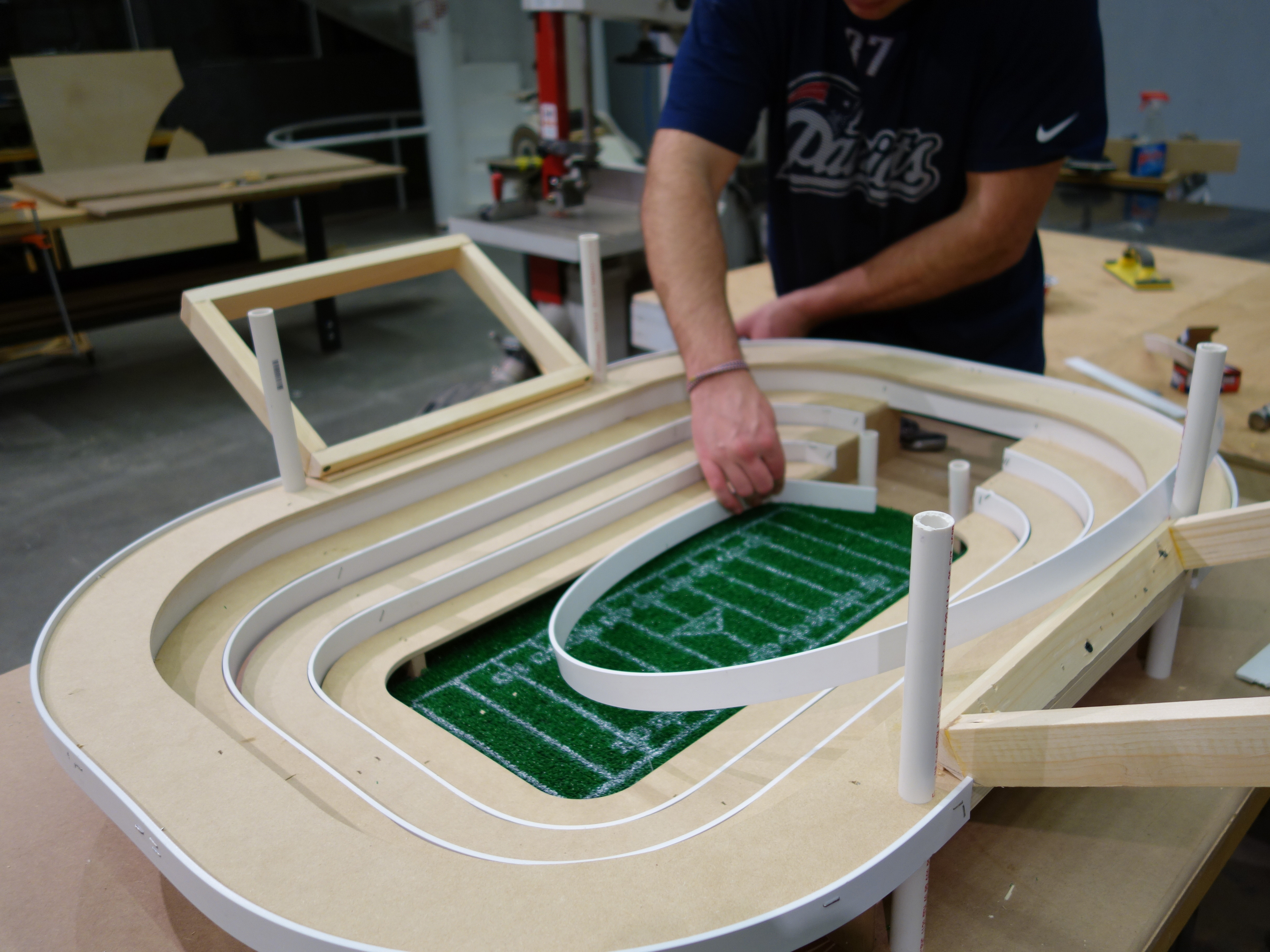 Using a CNC router, vinyl cutter, laser cutter, strip heater, and $200 in materials from Home Depot, Boston area inventor and builder Christian Reed constructed an awesomely detailed table-top stadium to hold the provisions for Sunday’s festivities.