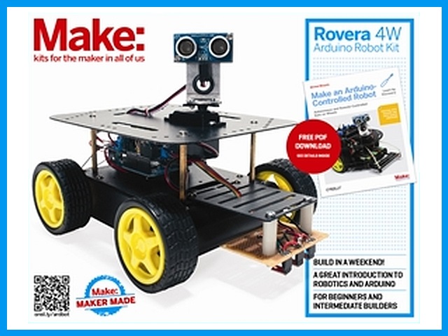 Not only do you get a great 4WD robot platform complete with Arduino Leonardo microcontroller, sensors, and necessary electronics, but you also get both printed and PDF forms of the Make an Arduino Controlled Robot book, by Michael Margolis. Nice. A slightly less expensive 2WD kit is also available.