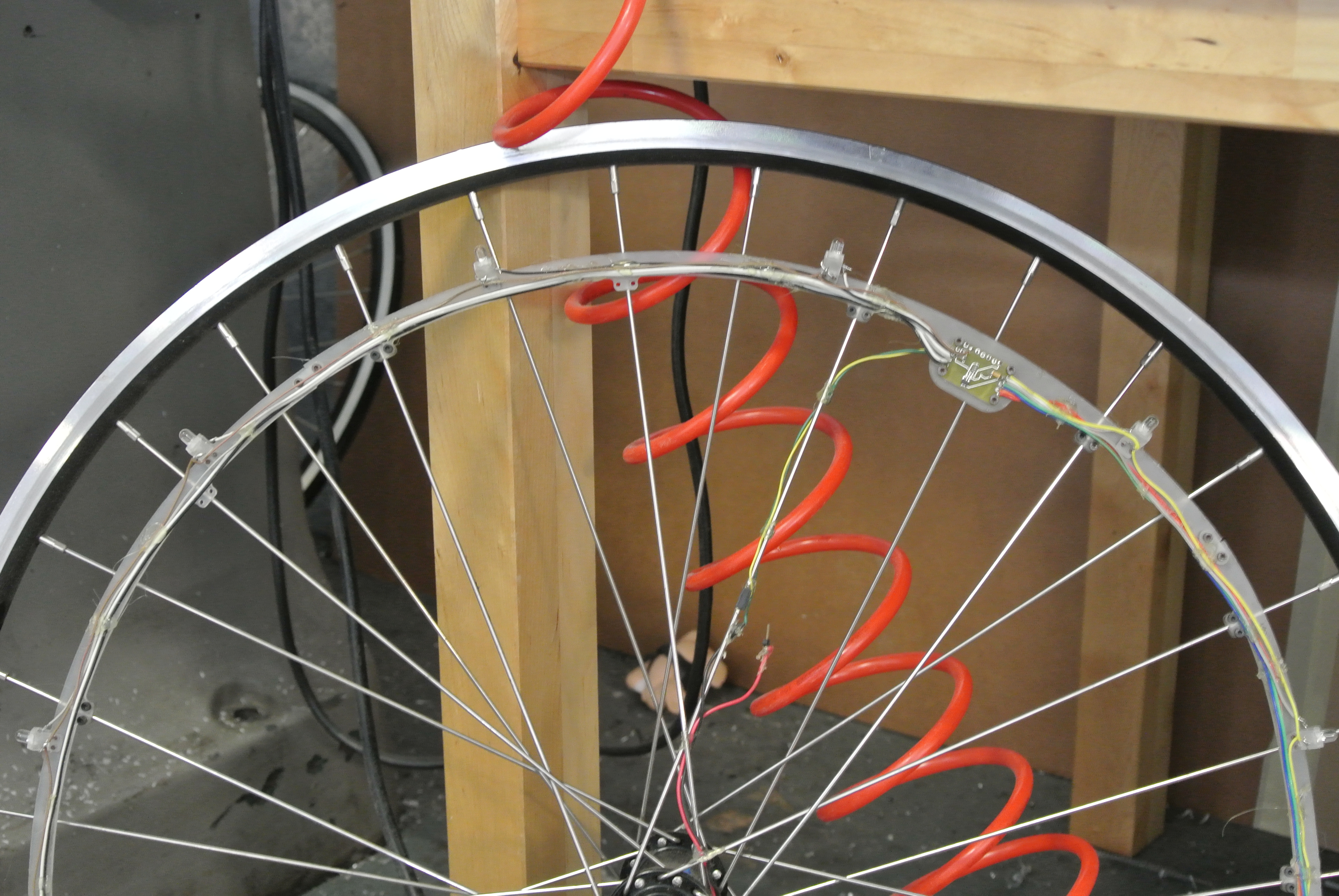 Newer versions have the LEDs mounted in a plastic ring that mounts on either side of the rim. An ATmega chip helps control the lights, including a rear version that flashes when it slows down.