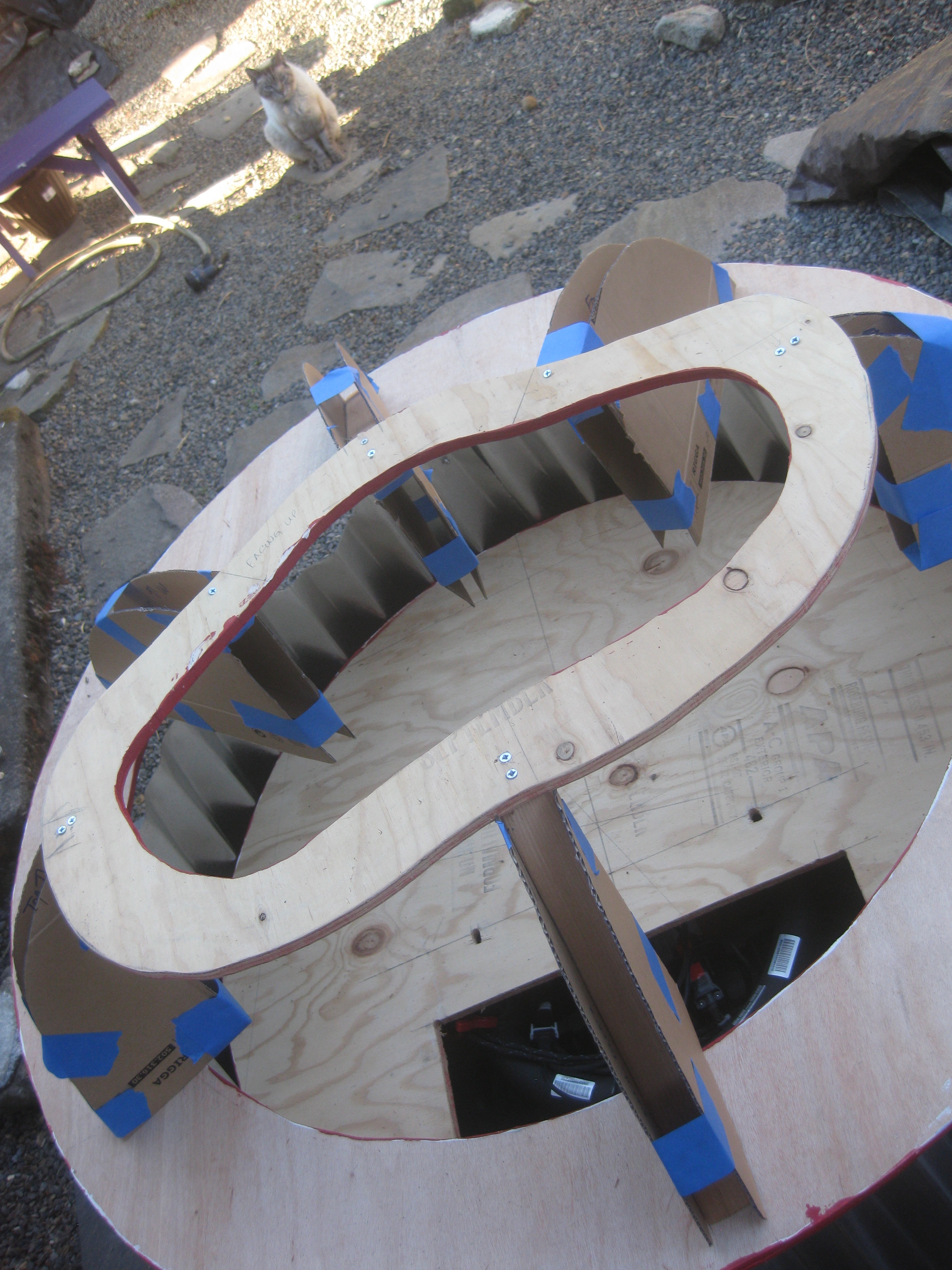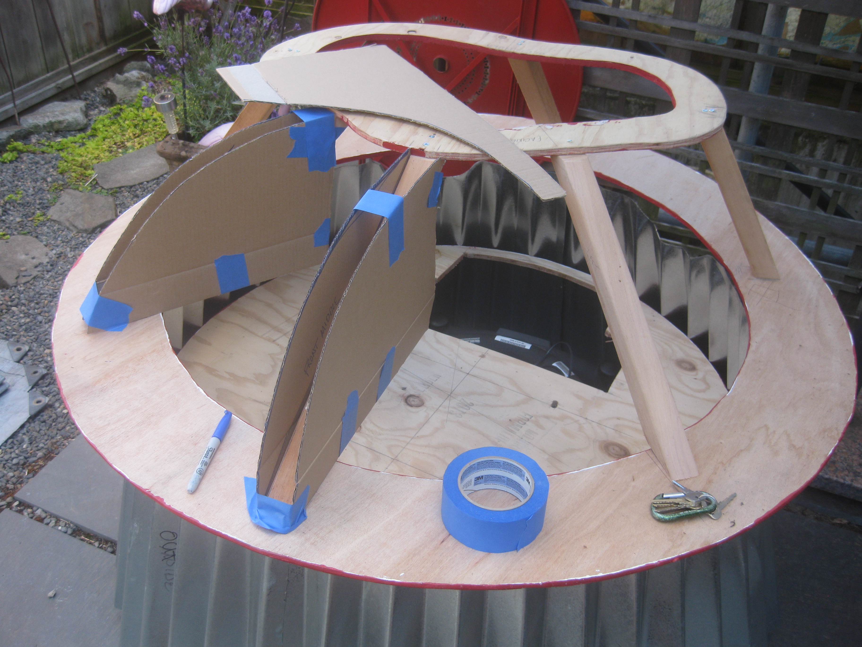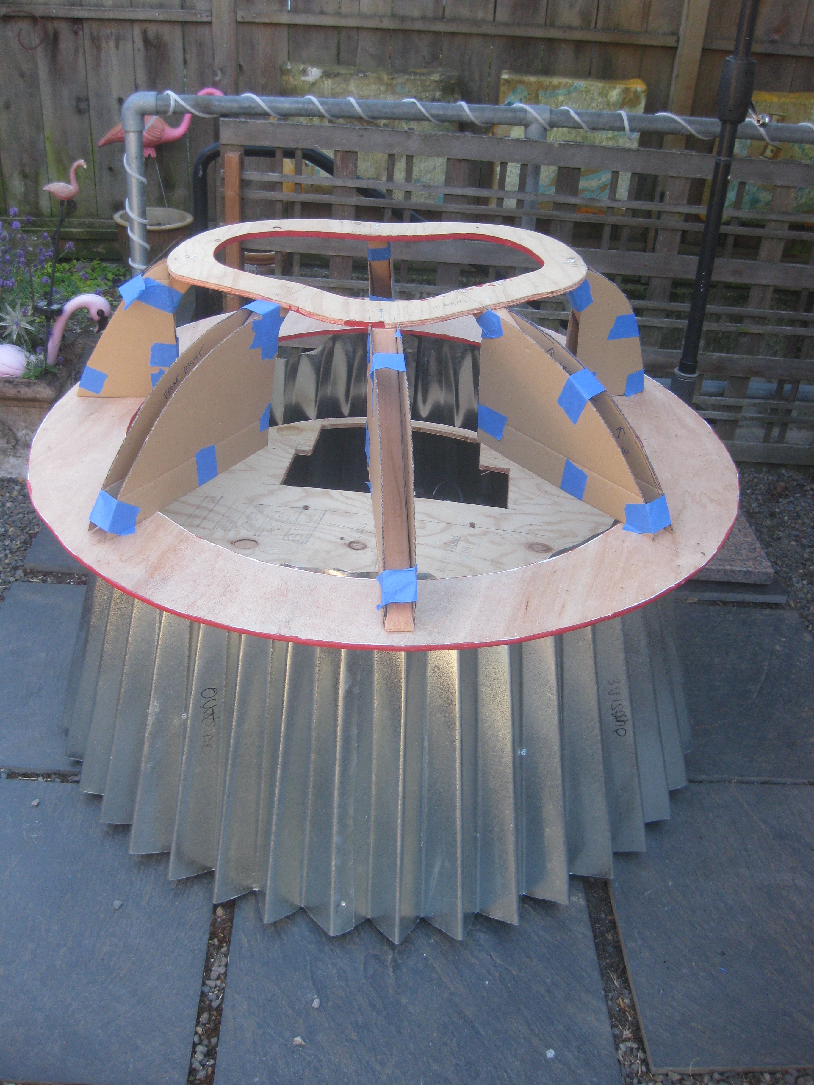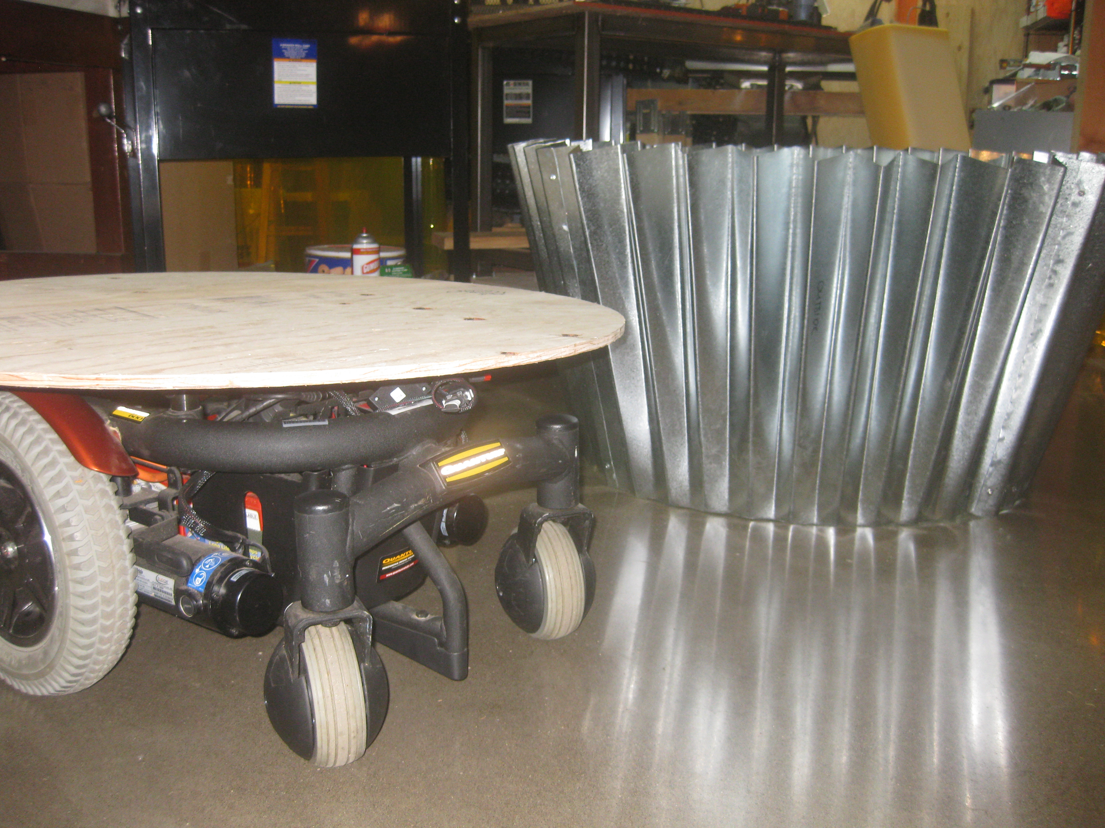 Now that it’s summer, the project has moved to my house and I’ve made significant progress on the cupcake in the last couple of weeks. A wood base sits as a platform on the mobility cart and the tins attach to it with six hinges. There’s a hole in the platform for my legs and I’m moving one of the two batteries up onto the platform to allow more room for my feet. Sections of the tin have been cut away to make room for moving wheels. To disguise the wheel openings, I’m planning to make cloven hooves to act as fenders. To give the illusion of flames and cover the higher ground clearance, I’m wrapping the bottom of the cupcake with metallic red and gold pennants that will flutter as the cupcake moves.
